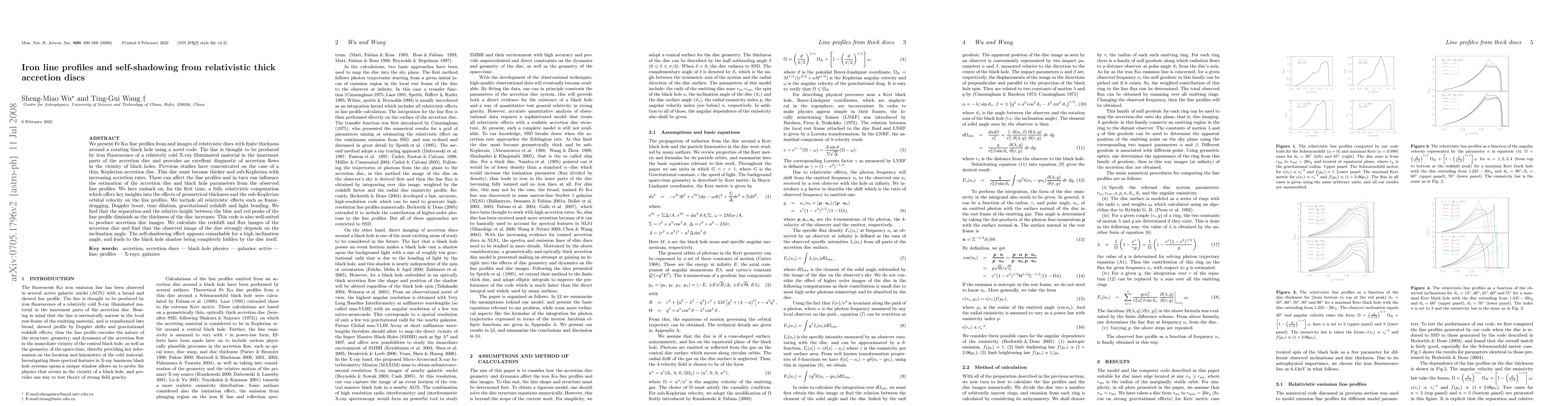This paper investigates Fe Kalpha line profiles and images from relativistic thick accretion discs around rotating black holes using a novel computational code. It finds that the thickness of the disc diminishes the separation and relative height between blue and red peaks in the line profile, and the observed disc image strongly depends on the inclination angle, with self-shadowing effects becoming significant at high inclinations.