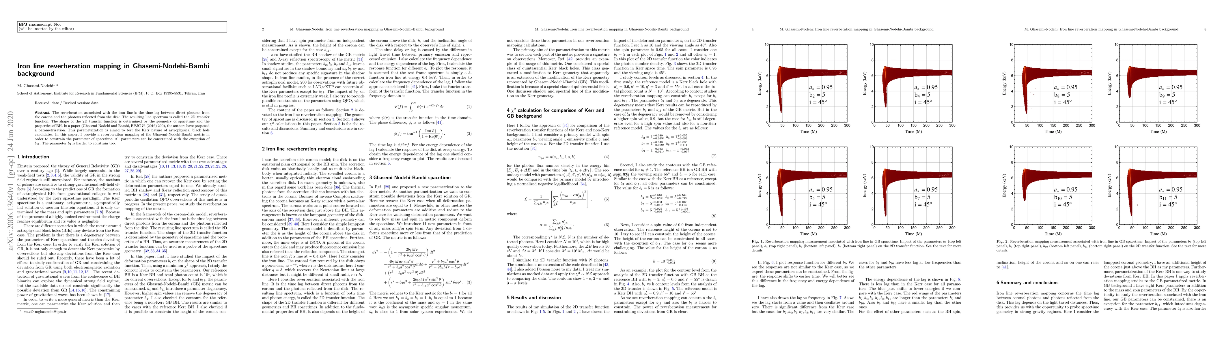 This paper conducts reverberation mapping of the iron line to analyze the 2D transfer function, using the Ghasemi-Nodehi-Bambi metric to test the Kerr nature of black holes. While most parameters are constrained, b11 and b4 remain challenging to determine.