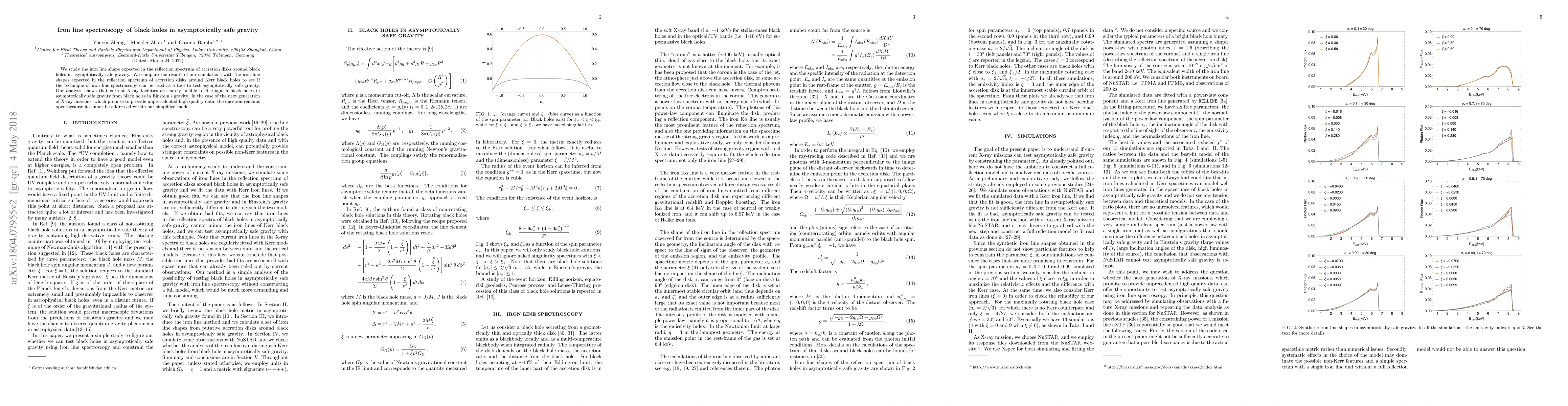 This paper examines the iron line in the reflection spectrum of accretion disks around black holes in asymptotically safe gravity, comparing it to Kerr black holes. Current X-ray facilities cannot differentiate between these black holes, but next-generation missions may offer more data, though the authors' simplified model does not yet provide a clear answer.