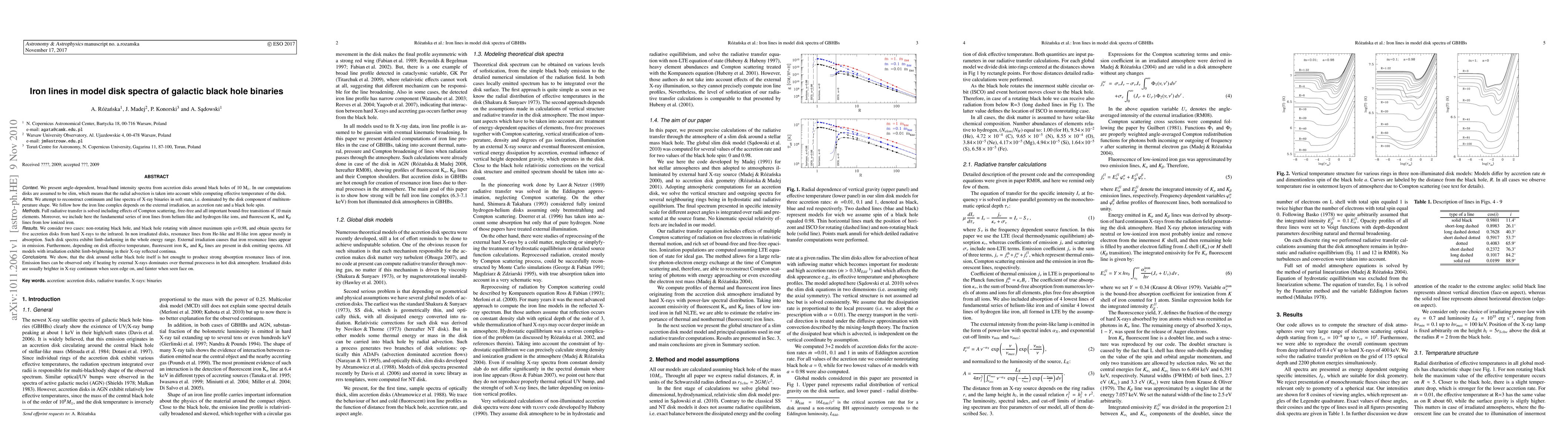 We present angle-dependent, broad-band intensity spectra from accretion disks around black holes of 10 M$_\odot$. In our computations disks are assumed to be slim, which means that the radial advection is taken into account while computing effective temperature of the disk. We attempt to reconstruct continuum and line spectra of X-ray binaries in soft state, i.e. dominated by the disk component of multitemperature shape. We follow how the iron line complex depends on the external irradiation, an accretion rate and a black hole spin. Full radiative transfer is solved including effects of Compton scattering, free-free and all important bound-free transitions of 10 main elements. Moreover, we include here the fundamental series of iron lines from helium-like and hydrogen-like ions, and fluorescent K$_{\alpha}$ and K$_{\beta}$ lines from low ionized iron. We consider two cases: non-rotating black hole, and black hole rotating with almost maximum spin a=0.98, and obtain spectra for five accretion disks from hard X-rays to the infrared. In non irradiated disks, resonance lines from He-like and H-like iron appear mostly in absorption. Such disk spectra exhibit limb-darkening in the whole energy range. External irradiation causes that iron resonance lines appear in emission. Furthermore, depending on disk effective temperature, fluorescent iron K$_{\alpha}$ and K$_{\beta}$ lines are present in disk emitting spectra.All models with irradiation exhibit limb-brightening in their X-ray reflected continua. We show, that the disk around stellar black hole itself is hot enought to produce strong absorption resonance lines of iron. Emission lines can be observed only if heating by external X-rays dominates over thermal processess in hot disk atmosphere. Irradiated disks are usually brighter in X-ray continuum when seen edge on, and fainter when seen face on.