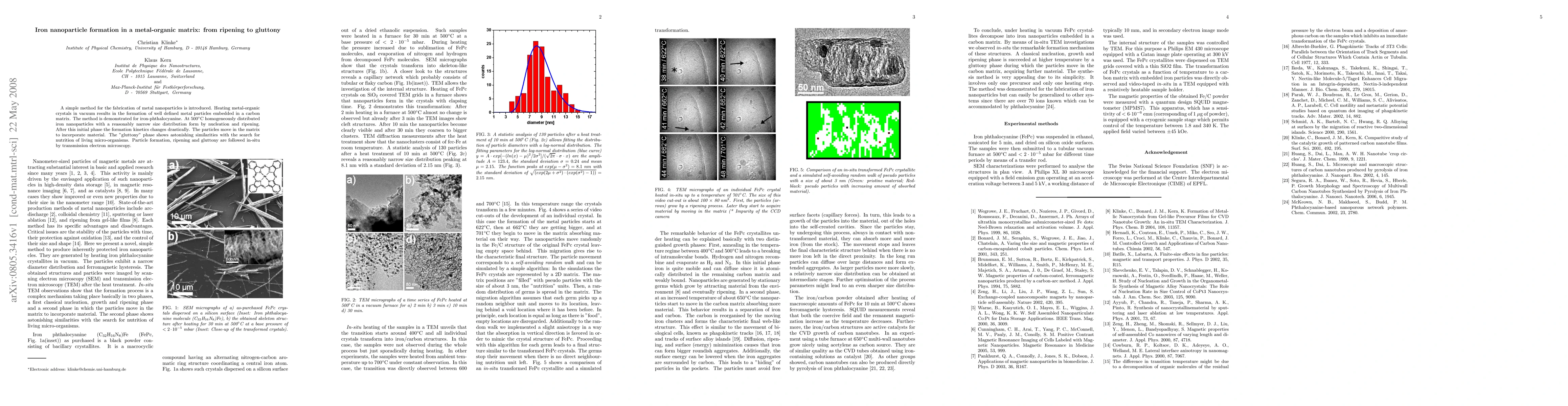 A simple method for the fabrication of metal nanoparticles is introduced. Heating metal-organic crystals in vacuum results in the formation of well defined metal particles embedded in a carbon matrix. The method is demonstrated for iron-phthalocyanine. At 500C homogeneously distributed iron nanoparticles with a reasonably narrow size distribution form by nucleation and ripening. After this initial phase the formation kinetics changes drastically. The particles move in the matrix to incorporate material. The "gluttony" phase shows astonishing similarities with the search for nutrition of living micro-organisms. Particle formation, ripening and gluttony are followed in-situ by transmission electron microscopy.