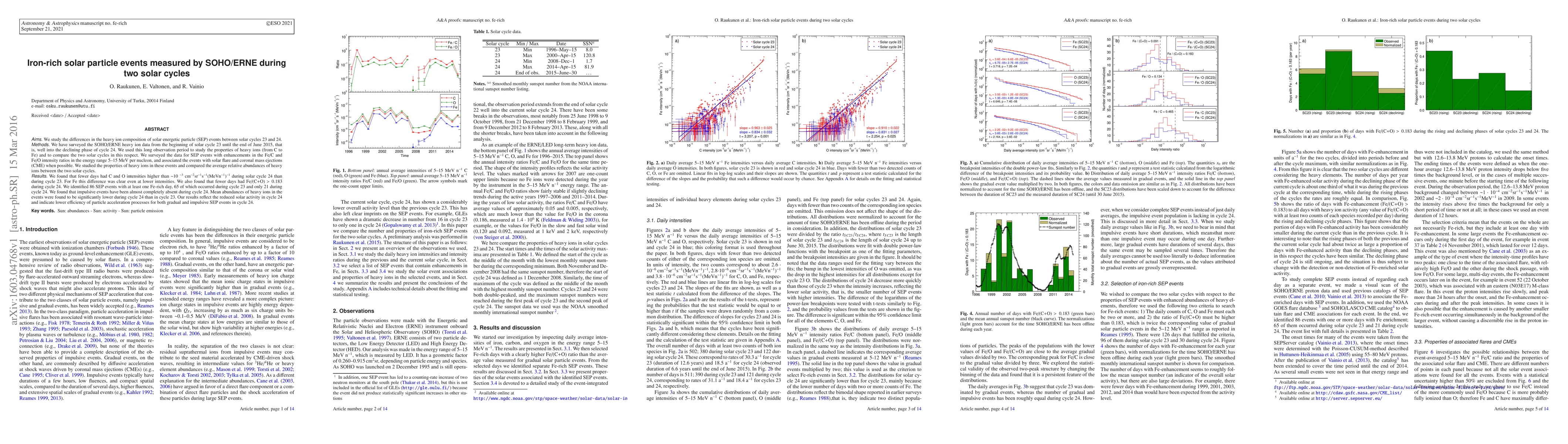 We study the differences in the heavy ion composition of solar energetic particle (SEP) events between solar cycles 23 and 24. We have surveyed the SOHO/ERNE heavy ion data from the beginning of solar cycle 23 until the end of June 2015, that is, well into the declining phase of cycle 24. We used this long observation period to study the properties of heavy ions (from C to Fe) and to compare the two solar cycles in this respect. We surveyed the data for SEP events with enhancements in the Fe/C and Fe/O intensity ratios in the energy range 5-15 MeV per nucleon, and associated the events with solar flare and coronal mass ejections (CME) when possible. We studied the properties of heavy ions in these events and compared the average relative abundances of heavy ions between the two solar cycles. We found that fewer days had C and O intensities higher than ~10$^{-3}$ cm$^{-2}$sr$^{-1}$s$^{-1}$(MeVn$^{-1}$)$^{-1}$ during solar cycle 24 than during cycle 23. For Fe this difference was clear even at lower intensities. We also found that fewer days had Fe/(C+O) > 0.183 during cycle 24. We identified 86 SEP events with at least one Fe-rich day, 65 of which occurred during cycle 23 and only 21 during cycle 24. We found that impulsive events have been almost completely absent during cycle 24. Mean abundances of heavy ions in the events were found to be significantly lower during cycle 24 than in cycle 23. Our results reflect the reduced solar activity in cycle 24 and indicate lower efficiency of particle acceleration processes for both gradual and impulsive SEP events in cycle 24.