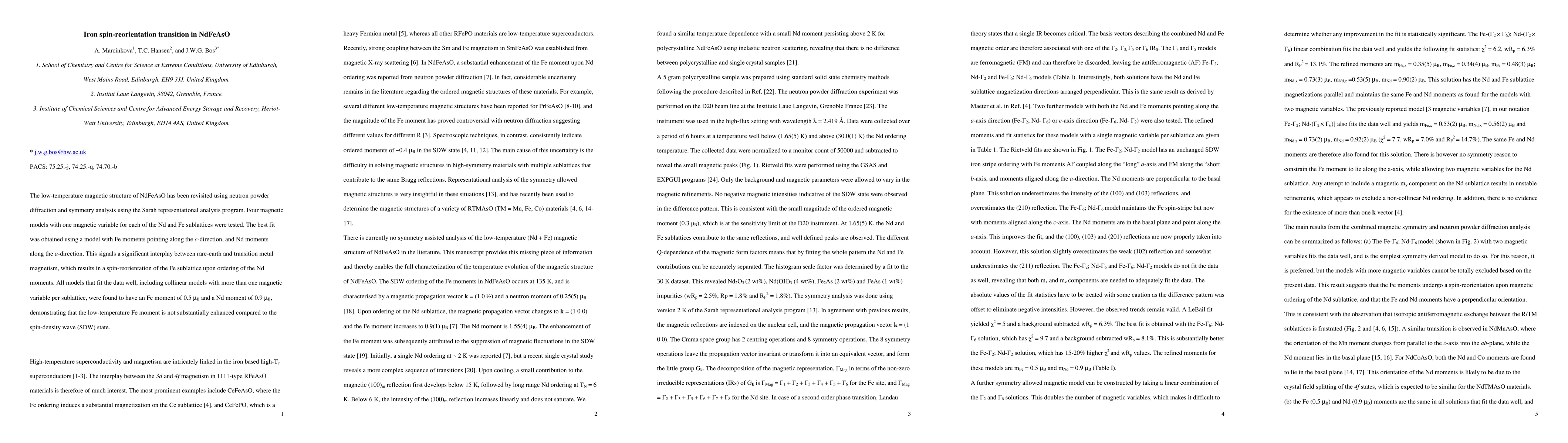 The study of NdFeAsO reveals a spin-reorientation transition where Fe moments align along the c-direction and Nd moments along the a-direction, indicating complex interactions between rare-earth and transition metal magnetism. The Fe moment remains at 0.5 BM, unchanged from the spin-density wave state, despite the reorientation.