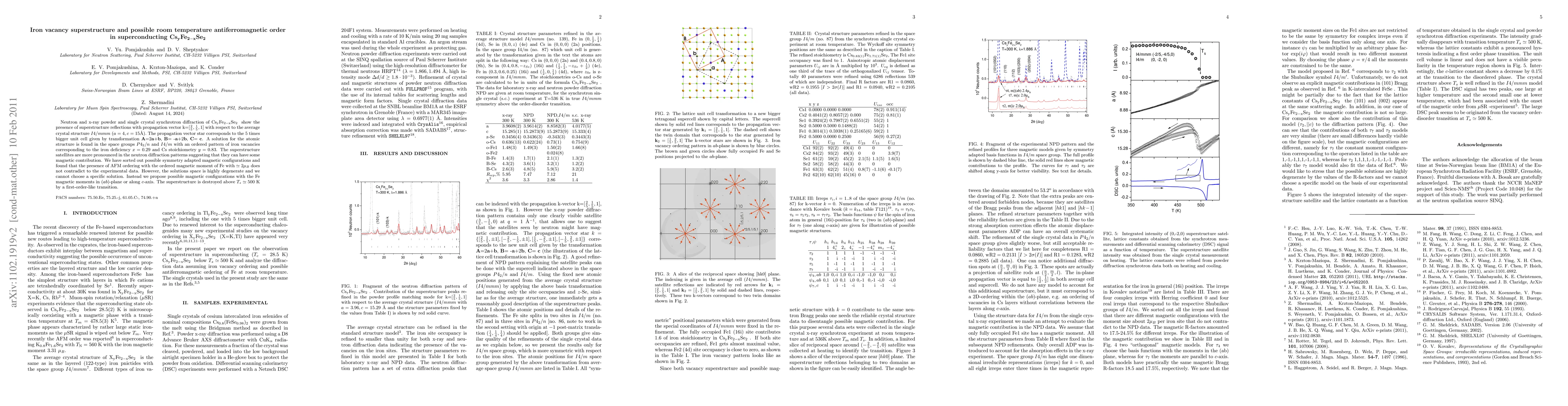 Neutron and x-ray powder and single crystal synchrotron diffraction of CsyFe2-xSe2 show the presence of superstructure reflections with propagation vector k=[2/5, 1/5, 1] with respect to the average crystal structure I4/mmm (a = 4, c = 15A). The propagation vector star corresponds to the 5 times bigger unit cell given by transformation A=2a+b, B= -a+2b, C= c. A solution for the atomic structure is found in the space groups P42/n and I4/m with an ordered pattern of iron vacancies corresponding to the iron deficiency x = 0.29 and Cs stoichiometry y = 0.83. The superstructure satellites are more pronounced in the neutron diffraction patterns suggesting that they can have some magnetic contribution. We have sorted out possible symmetry adapted magnetic configurations and found that the presence of AFM ordering with the ordered magnetic moment of Fe with 2{\mu}B does not contradict to the experimental data. However, the solutions space is highly degenerate and we cannot choose a specific solution. Instead we propose possible magnetic configurations with the Fe magnetic moments in (ab)-plane or along c-axis. The superstructure is destroyed above Ts ~ 500 K by a first-order-like transition.