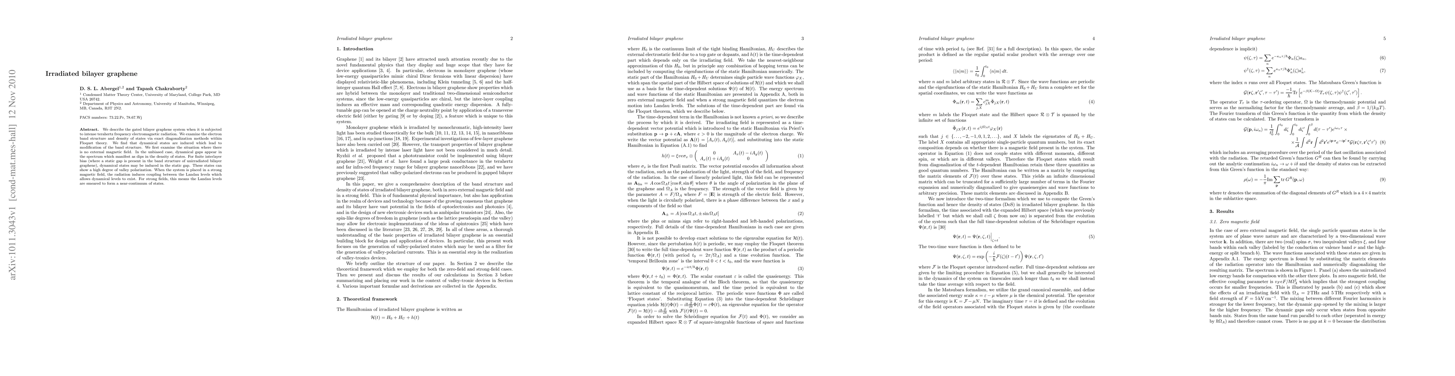 We describe the gated bilayer graphene system when it is subjected to intense terahertz frequency electromagnetic radiation. We examine the electron band structure and density of states via exact diagonalization methods within Floquet theory. We find that dynamical states are induced which lead to modification of the band structure. We first examine the situation where there is no external magnetic field. In the unbiased case, dynamical gaps appear in the spectrum which manifest as dips in the density of states. For finite interlayer bias (where a static gap is present in the band structure of unirradiated bilayer graphene), dynamical states may be induced in the static gap. These states can show a high degree of valley polarization. When the system is placed in a strong magnetic field, the radiation induces coupling between the Landau levels which allows dynamical levels to exist. For strong fields, this means the Landau levels are smeared to form a near-continuum of states.