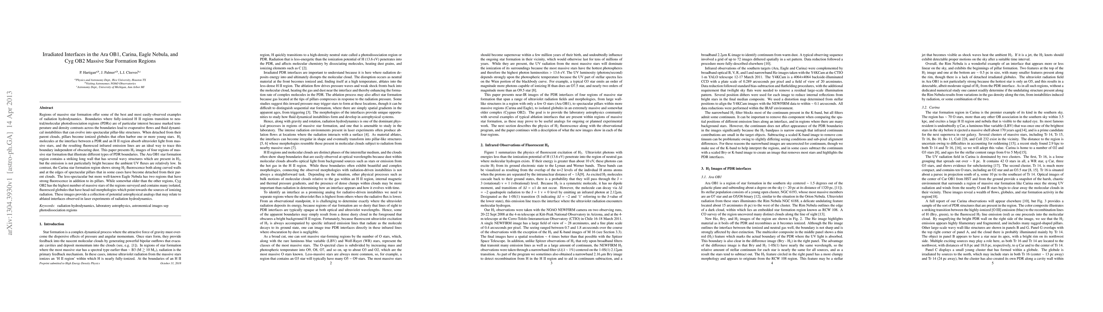 Regions of massive star formation offer some of the best and most easily-observed examples of radiation hydrodynamics. Boundaries where fully-ionized H II regions transition to neutral/molecular photodissociation regions (PDRs) are of particular interest because marked temperature and density contrasts across the boundaries lead to evaporative flows and fluid dynamical instabilities that can evolve into spectacular pillar-like structures. When detached from their parent clouds, pillars become ionized globules that often harbor one or more young stars. H2 molecules at the interface between a PDR and an H II region absorb ultraviolet light from massive stars, and the resulting fluoresced infrared emission lines are an ideal way to trace this boundary independent of obscuring dust. This paper presents H2 images of four regions of massive star formation that illustrate different types of PDR boundaries. The Ara OB1 star formation region contains a striking long wall that has several wavy structures which are present in H2, but the emission is not particularly bright because the ambient UV fluxes are relatively low. In contrast, the Carina star formation region shows strong H2 fluorescence both along curved walls and at the edges of spectacular pillars that in some cases have become detached from their parent clouds. The less-spectacular but more well-known Eagle Nebula has two regions that have strong fluorescence in addition to its pillars. While somewhat older than the other regions, Cyg OB2 has the highest number of massive stars of the regions surveyed and contains many isolated, fluoresced globules that have head-tail morphologies which point towards the sources of ionizing radiation. These images provide a collection of potential astrophysical analogs that may relate to ablated interfaces observed in laser experiments of radiation hydrodynamics.