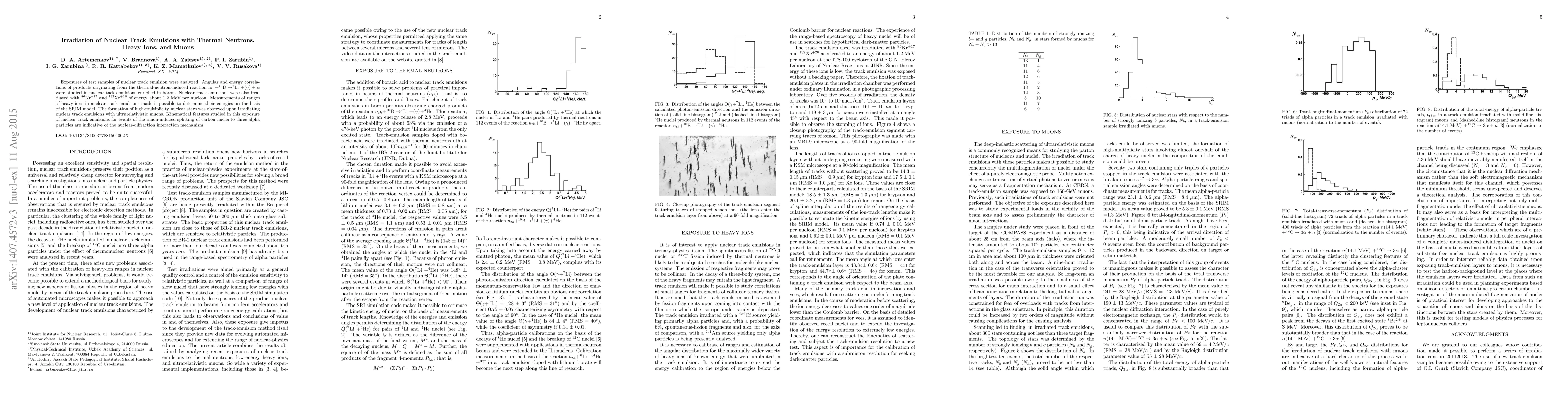 This paper investigates nuclear track emulsions exposed to thermal neutrons, heavy ions, and muons, analyzing angular and energy correlations from neutron-induced reactions and measuring heavy ion ranges to determine their energies. It also observes high-multiplicity nuclear stars and nuclear-diffraction interactions from muon-induced carbon nucleus splitting.