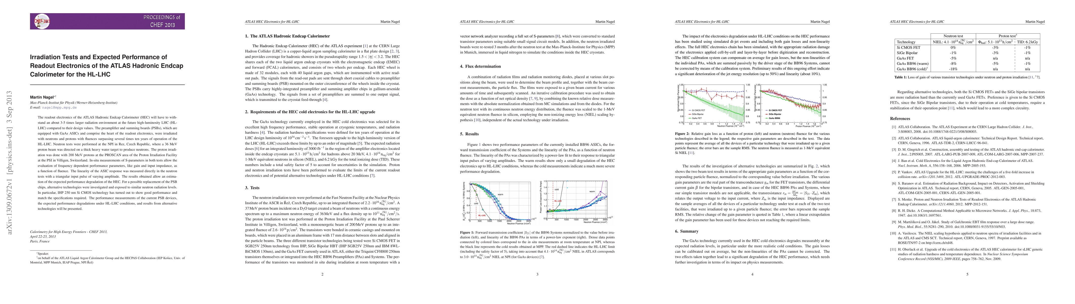 This paper details irradiation tests on the ATLAS Hadronic Endcap Calorimeter's readout electronics, assessing their performance under the higher radiation levels expected at the future high-luminosity LHC. Results indicate significant performance degradation, but promising performance from alternative IHP 250 nm Si CMOS technology.
