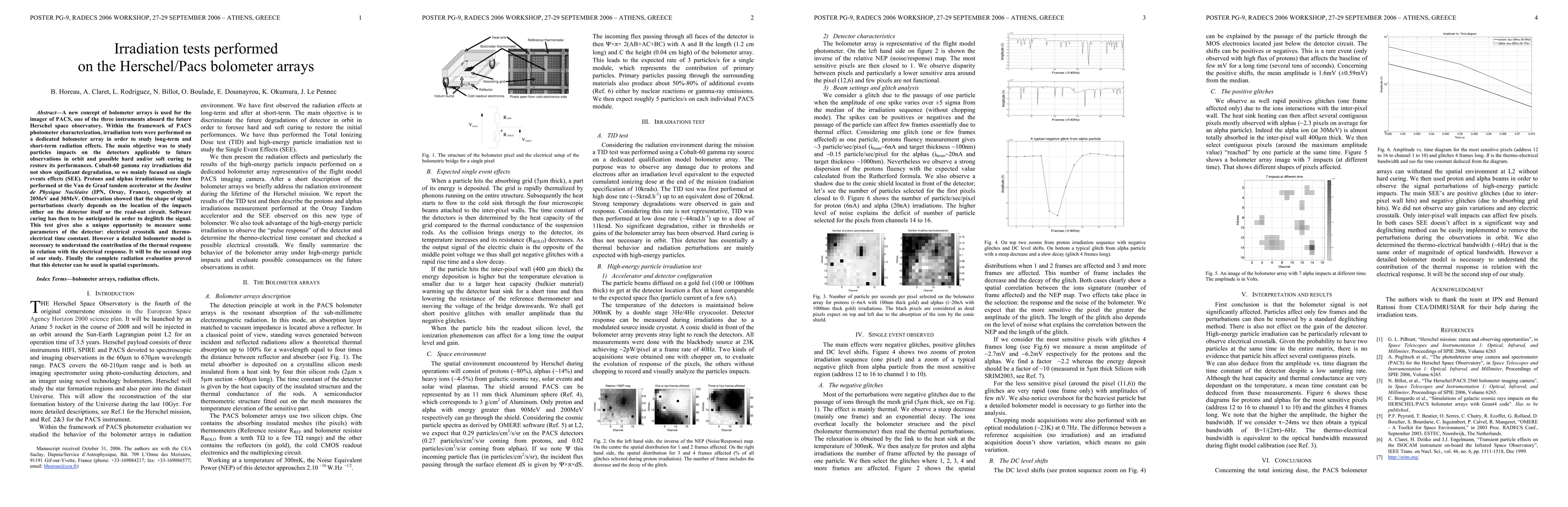 A new concept of bolometer arrays is used for the imager of PACS, one of the three instruments aboard the future Herschel space observatory. Within the framework of PACS photometer characterization, irradiation tests were performed on a dedicated bolometer array in order to study long-term and short-term radiation effects. The main objective was to study particles impacts on the detectors applicable to future observations in orbit and possible hard and/or soft curing to restore its performances. Cobalt-60 gamma ray irradiations did not show significant degradation, so we mainly focused on single events effects (SEE). Protons and alphas irradiations were then performed at the Van de Graaf tandem accelerator at the Institut de Physique Nucleaire (IPN, Orsay, France), respectively at 20MeV and 30MeV. Observation showed that the shape of signal perturbations clearly depends on the location of the impacts either on the detector itself or the read-out circuit. Software curing has then to be anticipated in order to deglitch the signal. This test gives also a unique opportunity to measure some parameters of the detector: electrical crosstalk and thermo- electrical time constant. However a detailed bolometer model is necessary to understand the contribution of the thermal response in relation with the electrical response. It will be the second step of our study. Finally the complete radiation evaluation proved that this detector can be used in spatial experiments.