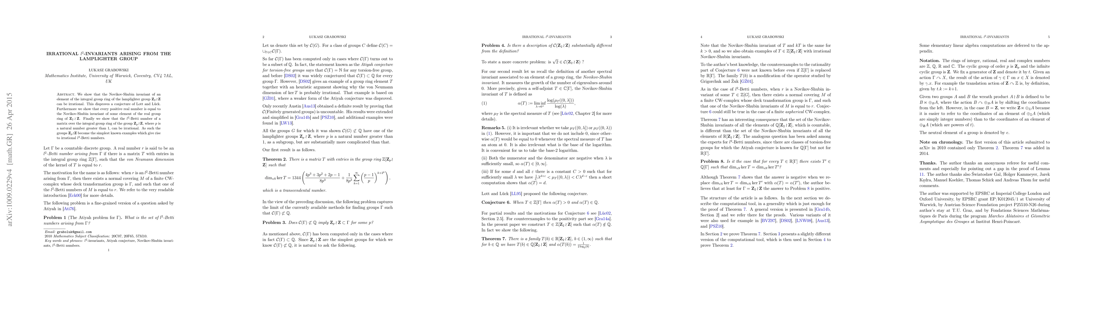 We show that the Novikov-Shubin invariant of an element of the integral group ring of the lamplighter group Z_2 \wr Z can be irrational. This disproves a conjecture of Lott and Lueck. Furthermore we show that every positive real number is equal to the Novikov-Shubin invariant of some element of the real group ring of Z_2 \wr Z. Finally we show that the l2-Betti number of a matrix over the integral group ring of the group Z_p \wr Z, p>1, can be irrational, and so the groups Z_p \wr Z become the simplest known groups which give rise to irrational l2-Betti numbers.
