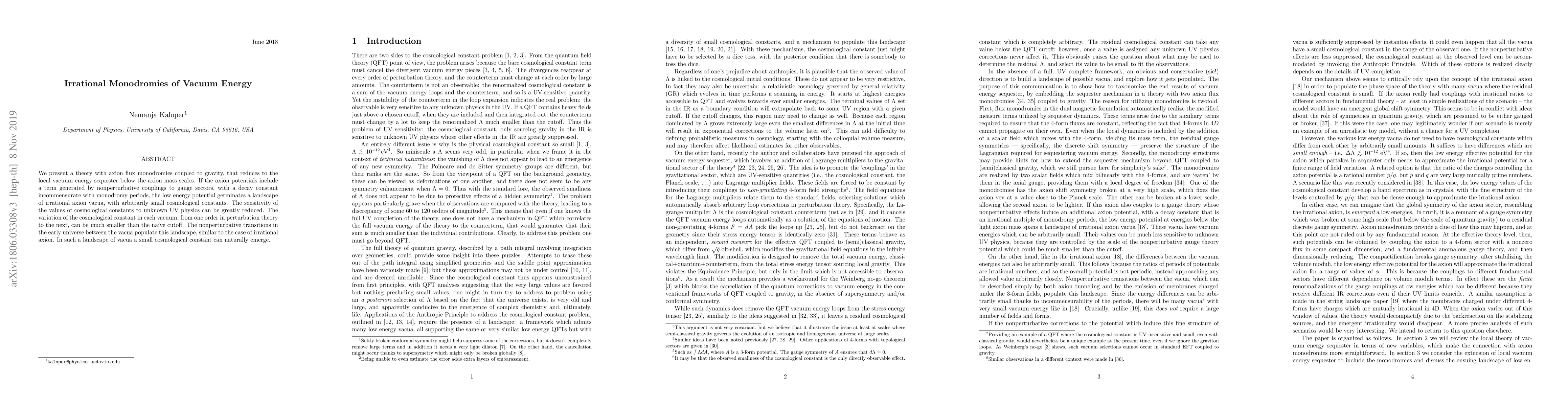 We present a theory with axion flux monodromies coupled to gravity, that reduces to the local vacuum energy sequester below the axion mass scales. If the axion potentials include a term generated by nonperturbative couplings to gauge sectors, with a decay constant incommensurate with monodromy periods, the low energy potential germinates a landscape of irrational axion vacua, with arbitrarily small cosmological constants. The sensitivity of the values of cosmological constants to unknown UV physics can be greatly reduced. The variation of the cosmological constant in each vacuum, from one order in perturbation theory to the next, can be much smaller than the na\"ive cutoff. The nonperturbative transitions in the early universe between the vacua populate this landscape, similar to the case of irrational axion. In such a landscape of vacua a small cosmological constant can naturally emerge.