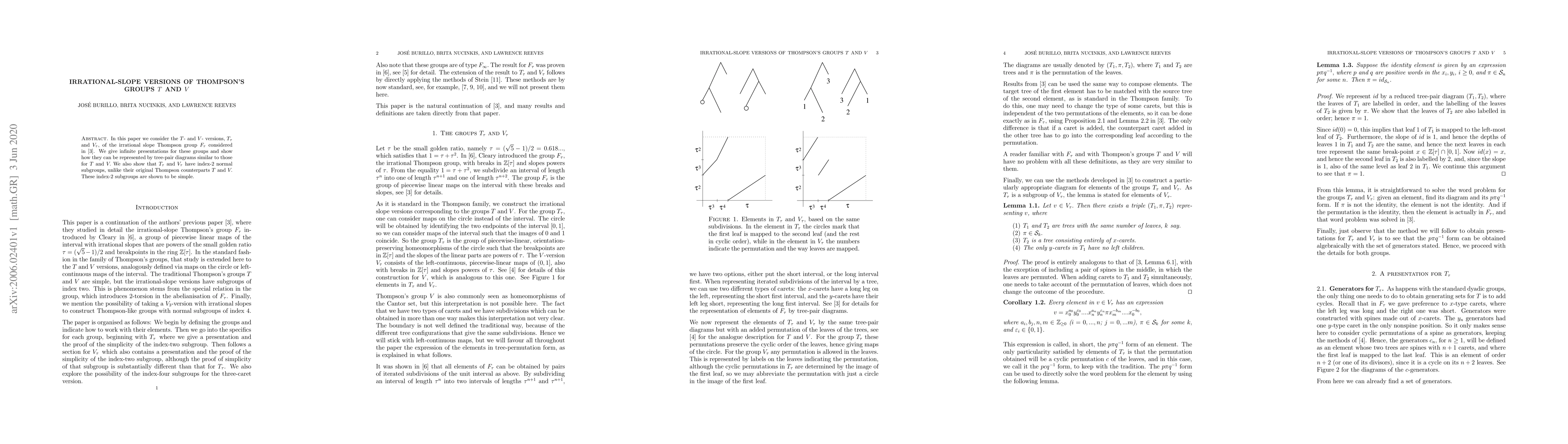 In this paper we consider the $T$- and $V$- versions, $T_{\tau}$ and $V_{\tau}$ , of the irrational slope Thompson group $F_{\tau}$ considered in [3]. We give infinite presentations for these groups and show how they can be represented by tree-pair diagrams similar to those for $T$ and $V$. We also show that $T_{\tau}$ and $V_{\tau}$ have index-2 normal subgroups, unlike their original Thompson counterparts $T$ and $V$. These index-2 subgroups are shown to be simple.