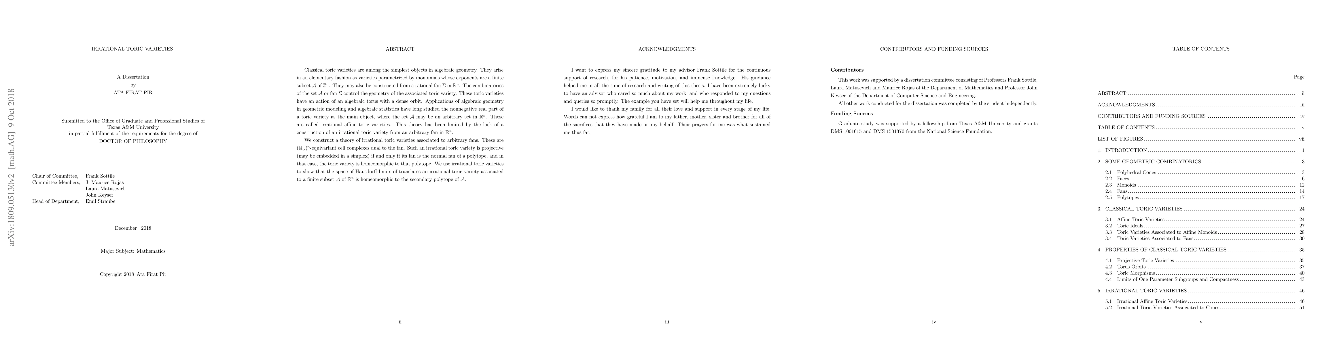 Classical toric varieties are among the simplest objects in algebraic geometry. They arise in an elementary fashion as varieties parametrized by monomials whose exponents are a finite subset $\mathcal{A}$ of $\mathbb{Z}^n$. They may also be constructed from a rational fan $\Sigma$ in $\mathbb{R}^n$. The combinatorics of the set $\mathcal{A}$ or fan $\Sigma$ control the geometry of the associated toric variety. These toric varieties have an action of an algebraic torus with a dense orbit. Applications of algebraic geometry in geometric modeling and algebraic statistics have long studied the nonnegative real part of a toric variety as the main object, where the set $\mathcal{A}$ may be an arbitrary set in $\mathbb{R}^n$. These are called irrational affine toric varieties. This theory has been limited by the lack of a construction of an irrational toric variety from an arbitrary fan in $\mathbb{R}^n$. We construct a theory of irrational toric varieties associated to arbitrary fans. These are $(\mathbb{R}_>)^n$-equivariant cell complexes dual to the fan. Such an irrational toric variety is projective (may be embedded in a simplex) if and only if its fan is the normal fan of a polytope, and in that case, the toric variety is homeomorphic to that polytope. We use irrational toric varieties to show that the space of Hausdorff limits of translates an irrational toric variety associated to a finite subset $\mathcal{A}$ of $\mathbb{R}^n$ is homeomorphic to the secondary polytope of $\mathcal{A}$.
