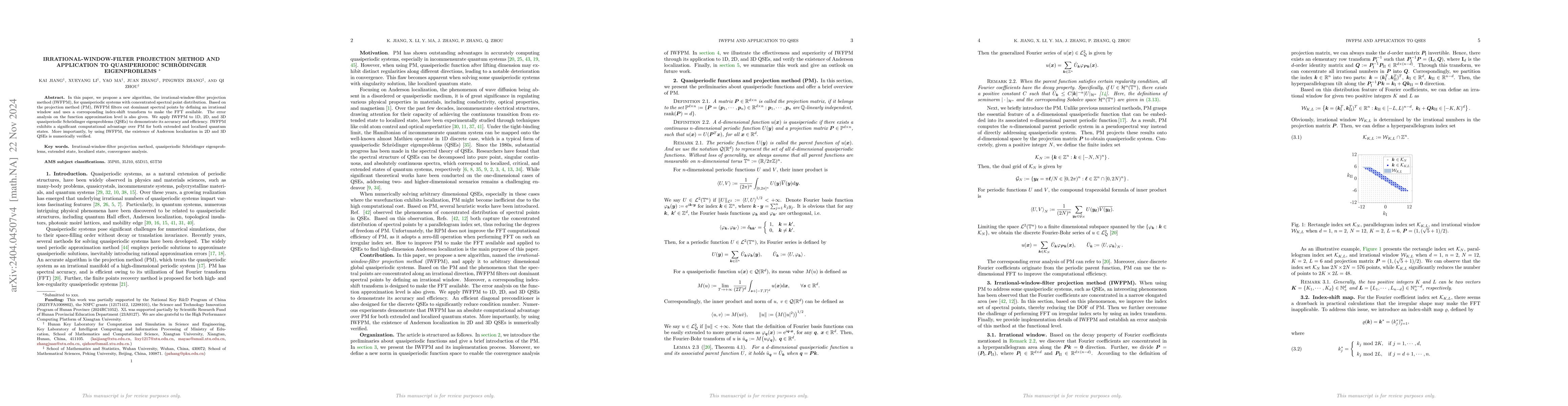 This paper introduces the Irrational-window-filter projection method (IWFPM) for solving global quasiperiodic systems, leveraging concentrated Fourier coefficients to enhance computational efficiency. The method shows superior accuracy and efficiency in solving 1D, 2D, and 3D quasiperiodic Schrödinger eigenproblems compared to traditional projection methods.