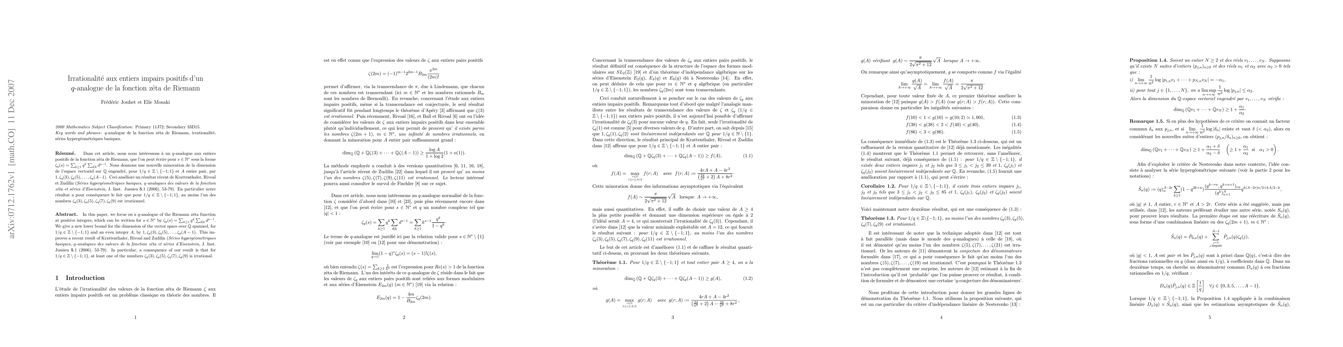 This paper studies a q-analogue of the Riemann zeta function at positive odd integers, providing a new lower bound for the dimension of the vector space spanned by these values. It shows that at least one of the values \zeta_q(3), \zeta_q(5), \zeta_q(7), \zeta_q(9) is irrational for 1/q not equal to -1 or 1.