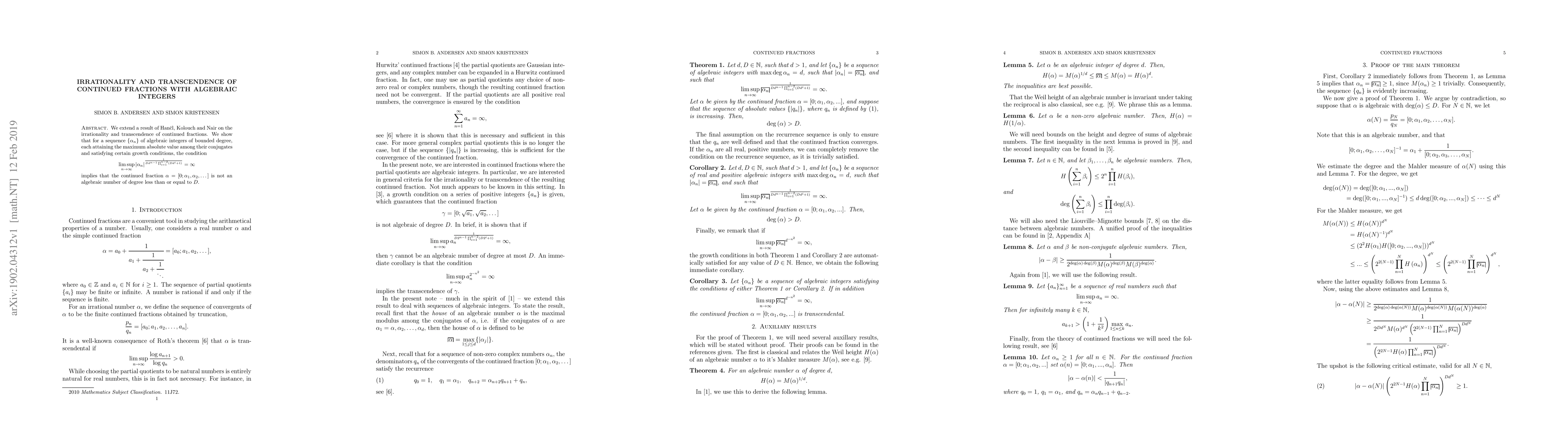 This paper extends previous results on the irrationality and transcendence of continued fractions, proving that for a sequence of algebraic integers with specific growth conditions, the continued fraction formed by these integers is transcendental and not algebraic of a certain degree. The key condition involves the limit superior of the sequence's absolute values under a particular growth factor.