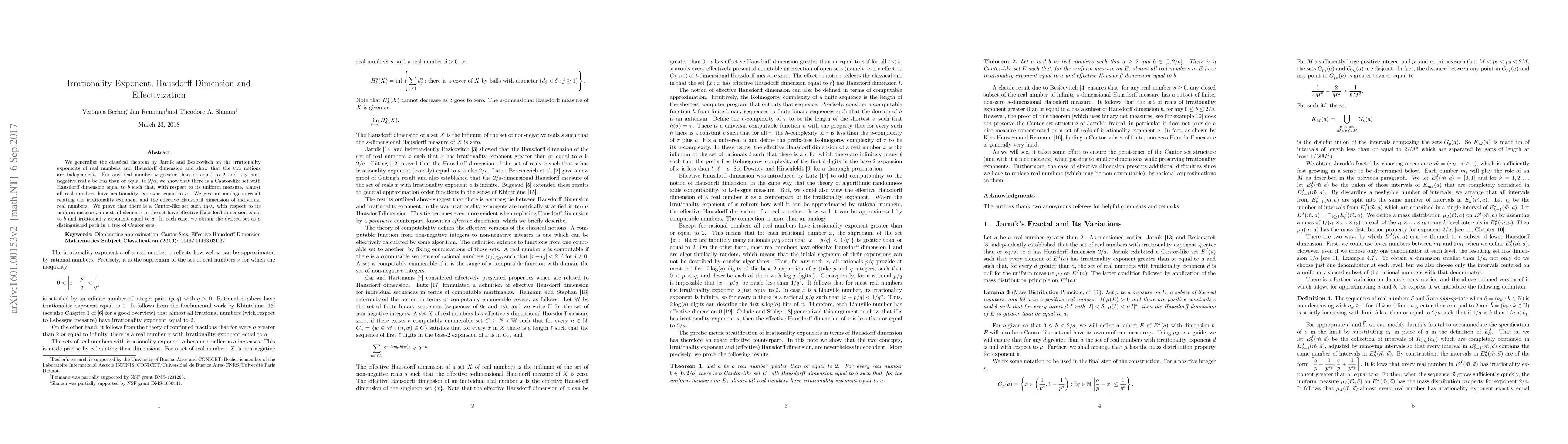 We generalize the classical theorem by Jarnik and Besicovitch on the irrationality exponents of real numbers and Hausdorff dimension. Let a be any real number greater than or equal to 2 and let b be any non-negative real less than or equal to 2/a. We show that there is a Cantor-like set with Hausdorff dimension equal to b such that, with respect to its uniform measure, almost all real numbers have irrationality exponent equal to a. We give an analogous result relating the irrationality exponent and the effective Hausdorff dimension of individual real numbers. We prove that there is a Cantor-like set such that, with respect to its uniform measure, almost all elements in the set have effective Hausdorff dimension equal to b and irrationality exponent equal to a. In each case, we obtain the desired set as a distinguished path in a tree of Cantor sets.