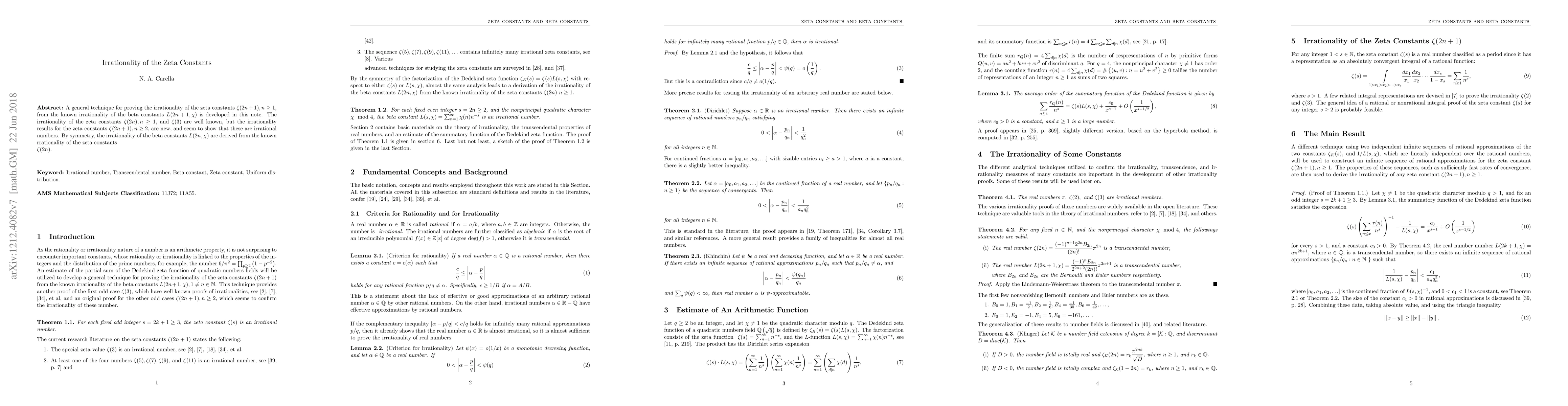 A general technique for proving the irrationality of the zeta constants $\zeta(s)$ for odd $s = 2n + 1 \geq 3$ from the known irrationality of the beta constants $L(2n+1)$ is developed in this note. The results on the irrationality of the zeta constants $\zeta(2n)$, where $n\geq 1$, and $\zeta(3)$ are well known, but the results on the irrationality for the zeta constants $\zeta(2n+1)$, where $n \geq 2$, are new, and these results seem to confirm that these constants are irrational numbers.