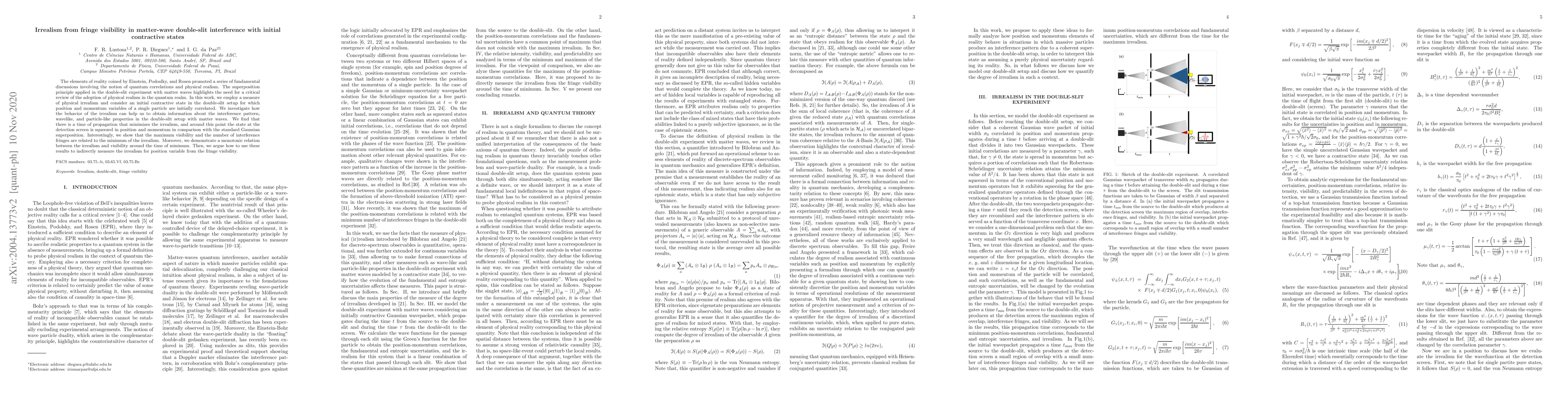 This paper explores quantum irrealism in the context of matter-wave double-slit interference with initial contractive states, finding a time of propagation that minimizes irrealism and correlates it to the visibility and number of interference fringes. It proposes a method to indirectly measure irrealism from fringe visibility.