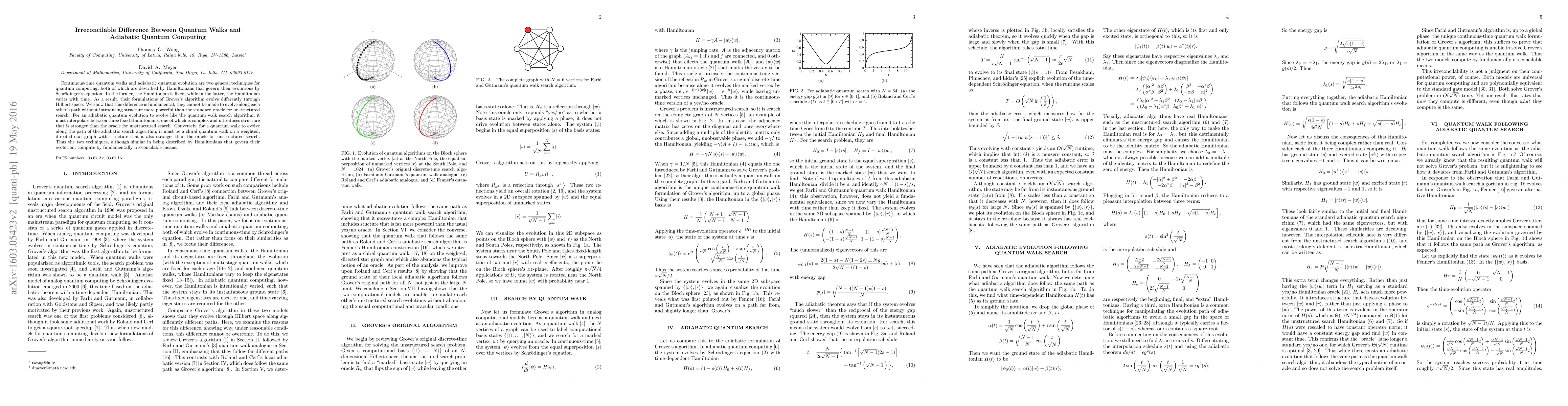 This paper demonstrates that continuous-time quantum walks and adiabatic quantum computing, both governed by Hamiltonians, fundamentally differ in their computational methods. Neither can evolve along the path of the other without introducing structure more powerful than the standard oracle for unstructured search.