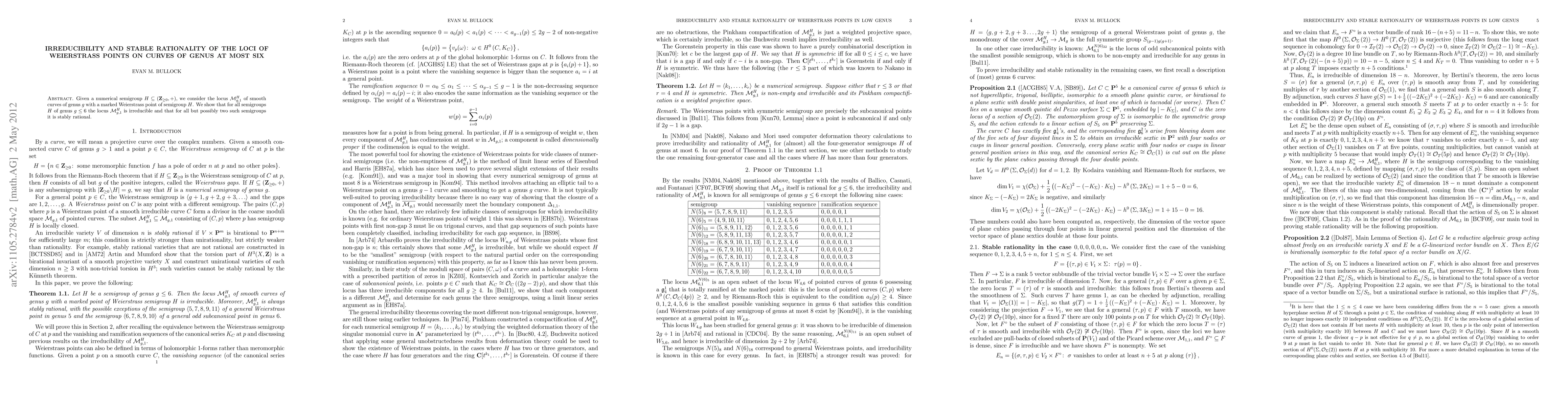 We show that for any numerical semigroup H of genus g at most 6, the locus of Weierstrass points on curves of genus g with Weierstrass semigroup H is irreducible and that for all but possibly two semigroups it is stably rational.