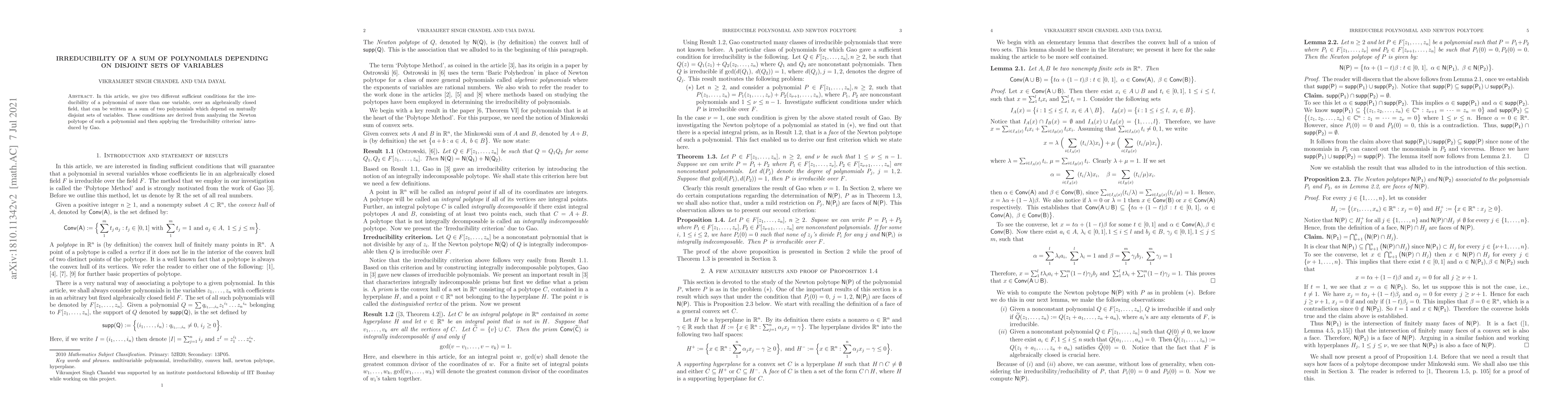 In this article, we give two different sufficient conditions for the irreducibility of a polynomial of more than one variable, over the field of complex numbers, that can be written as a sum of two polynomials which depend on mutually disjoint sets of variables. These conditions are derived from analyzing the Newton polytope of such a polynomial and then applying the `Irreducibility criterion' introduced by Gao.