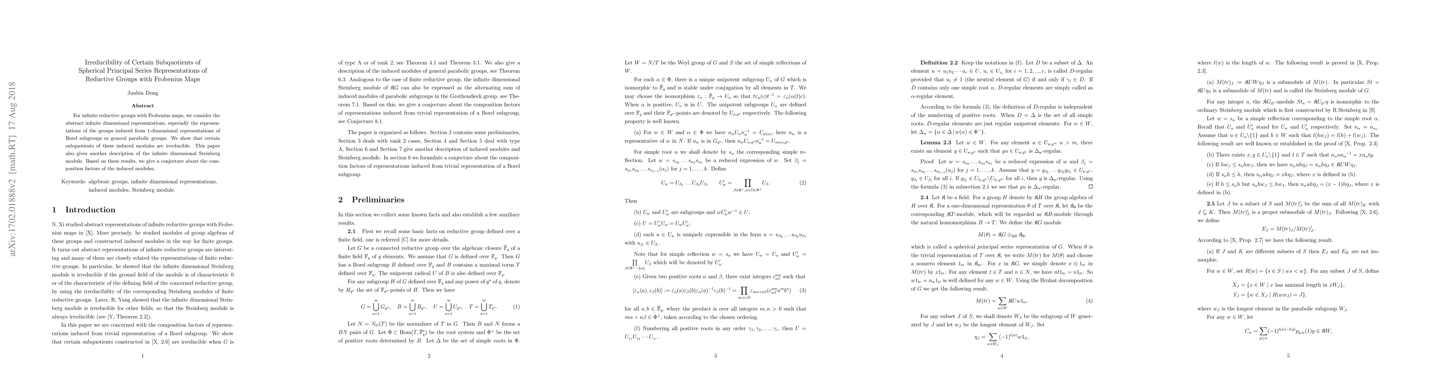 Summary: This paper proves the irreducibility of specific subquotients derived from induced representations of infinite reductive groups, particularly focusing on those transformed via Frobenius maps, which originate from 1-dimensional representations of Borel subgroups.