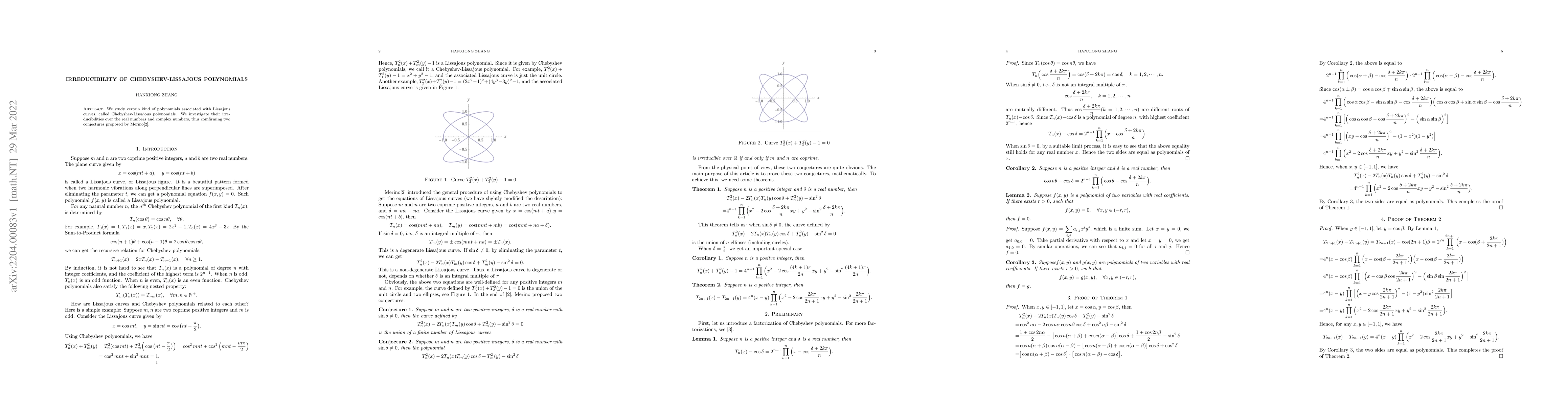 Summary: This paper examines the irreducibility of Chebyshev-Lissajous polynomials over real and complex numbers, confirming two conjectures by Merino regarding their structural properties.