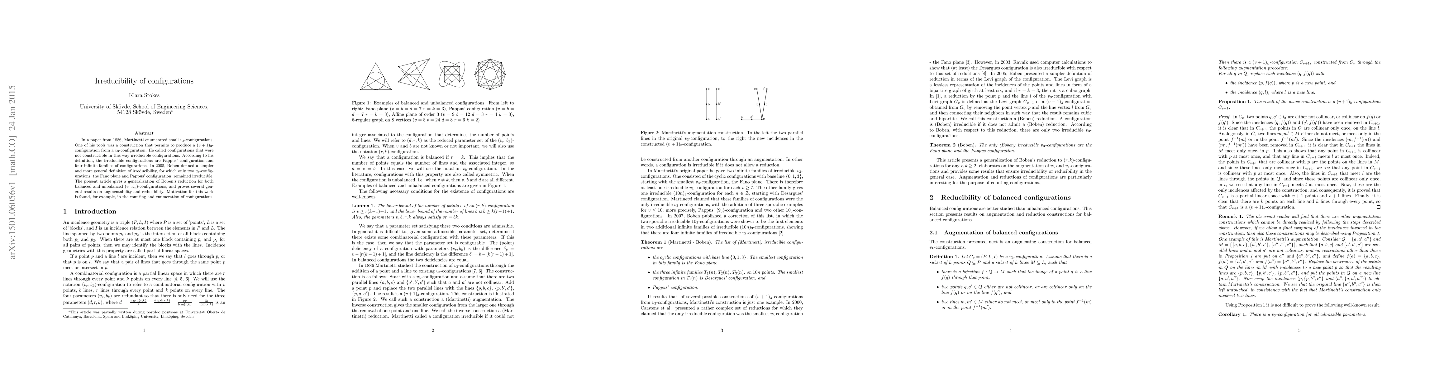 In a paper from 1886, Martinetti enumerated small $v_3$-configurations. One of his tools was a construction that permits to produce a $(v+1)_3$-configuration from a $v_3$-configuration. He called configurations that were not constructible in this way irreducible configurations. According to his definition, the irreducible configurations are Pappus' configuration and four infinite families of configurations. In 2005, Boben defined a simpler and more general definition of irreducibility, for which only two $v_3$-configurations, the Fano plane and Pappus' configuration, remained irreducible. The present article gives a generalization of Boben's reduction for both balanced and unbalanced $(v_r,b_k)$-configurations, and proves several general results on augmentability and reducibility. Motivation for this work is found, for example, in the counting and enumeration of configurations.