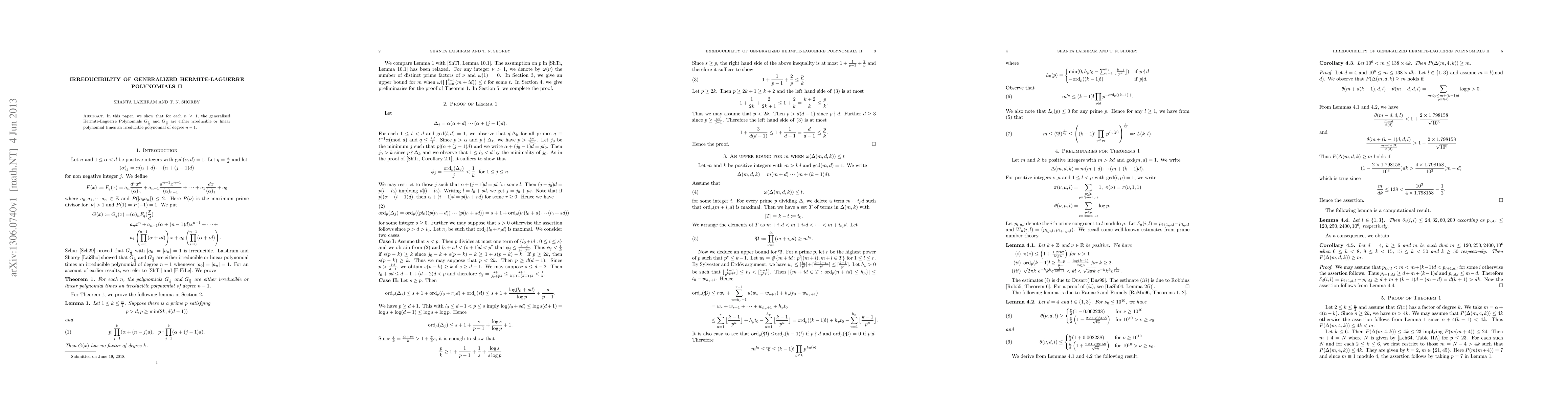 This paper demonstrates that for each $n \geq 1$, the generalized Hermite-Laguerre polynomials $G_{\frac{1}{4}}$ and $G_{\frac{3}{4}}$ are either irreducible or can be expressed as a linear polynomial multiplied by an irreducible polynomial of degree $n-1$.