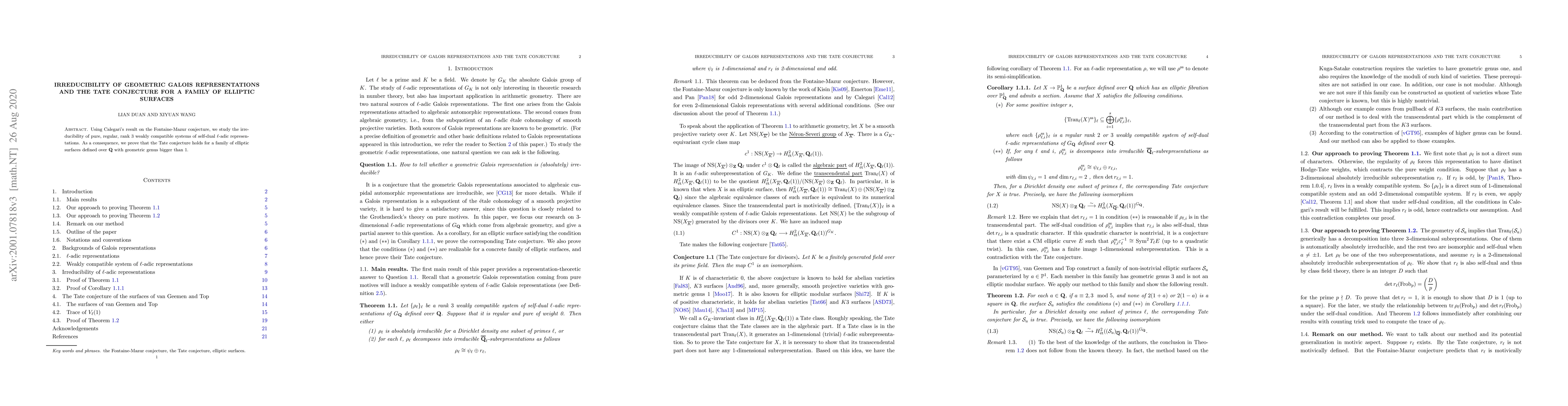 This paper utilizes Calegari's findings on the Fontaine-Mazur conjecture to investigate the irreducibility of specific l-adic representations, ultimately proving the Tate conjecture for a family of elliptic surfaces over Q with a geometric genus greater than 1.