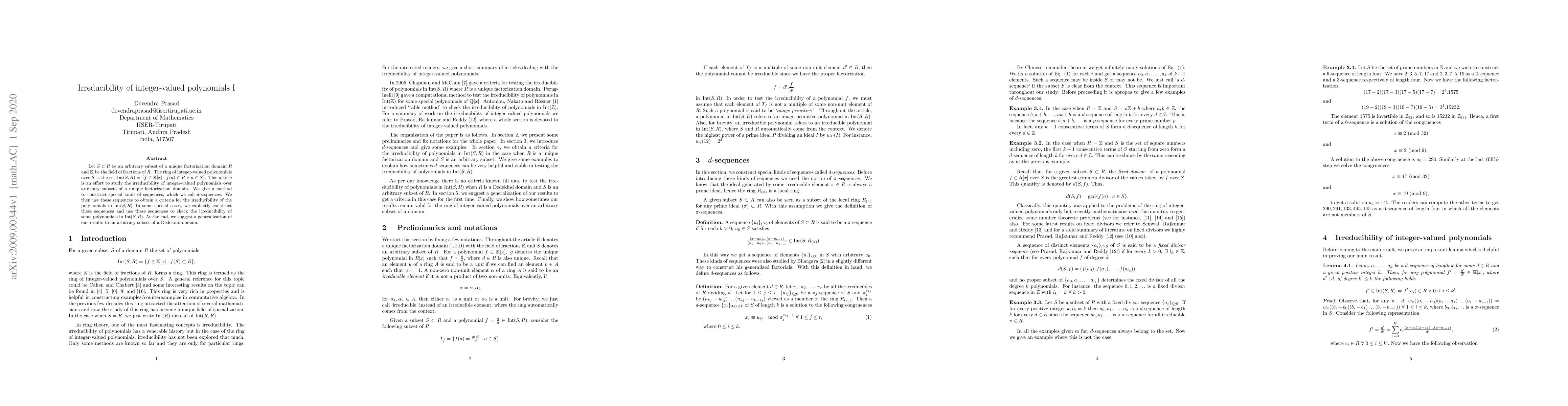 This paper investigates the irreducibility of integer-valued polynomials over subsets of a unique factorization domain, introducing $d$-sequences to establish criteria for irreducibility. It also suggests extending these results to Dedekind domains.