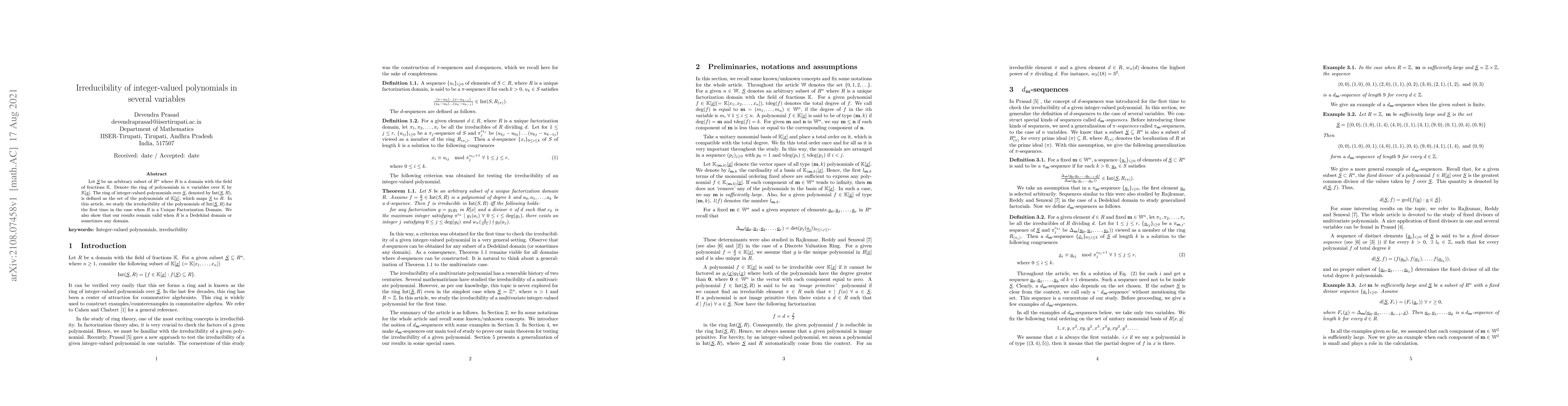 This paper investigates the irreducibility of integer-valued polynomials in several variables over a subset $\S$ of $R^n$, where $R$ is a domain. It establishes results for UFDs and extends them to Dedekind domains and general domains.