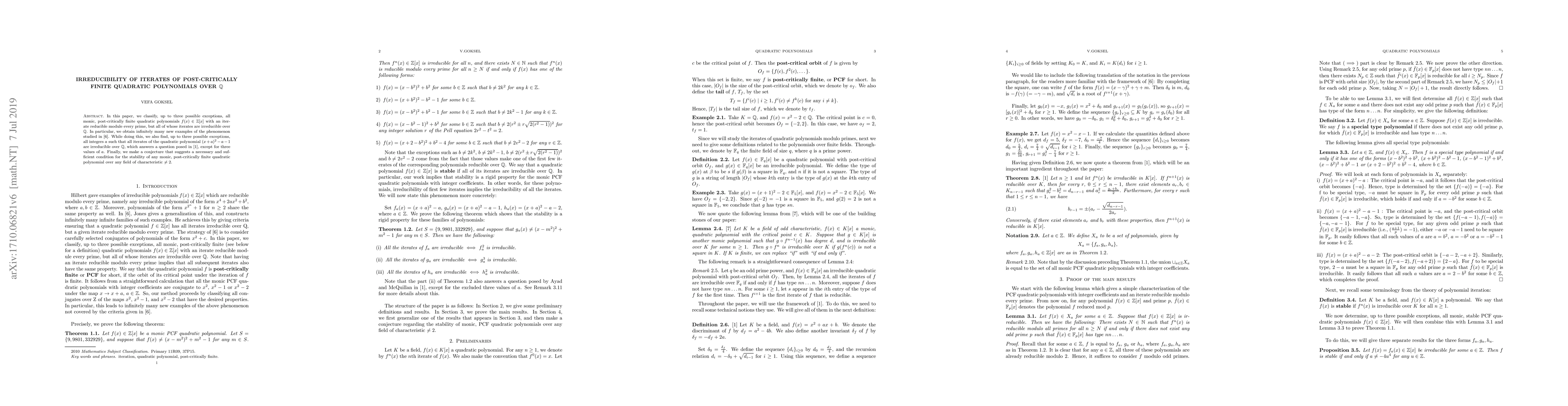 In this paper, we classify, up to three possible exceptions, all monic, post-critically finite quadratic polynomials $f(x)\in \mathbb{Z}[x]$ with an iterate reducible module every prime, but all of whose iterates are irreducible over $\mathbb{Q}$. In particular, we obtain infinitely many new examples of the phenomenon studied in \cite{Jones}. While doing this, we also find, up to three possible exceptions, all integers $a$ such that all iterates of the quadratic polynomial $(x+a)^2-a-1$ are irreducible over $\mathbb{Q}$, which answers a question posed in \cite{AyadMcdonald}, except for three values of $a$. Finally, we make a conjecture that suggests a necessary and sufficient condition for the stability of any monic, post-critically finite quadratic polynomial over any field of characteristic $\neq 2$.