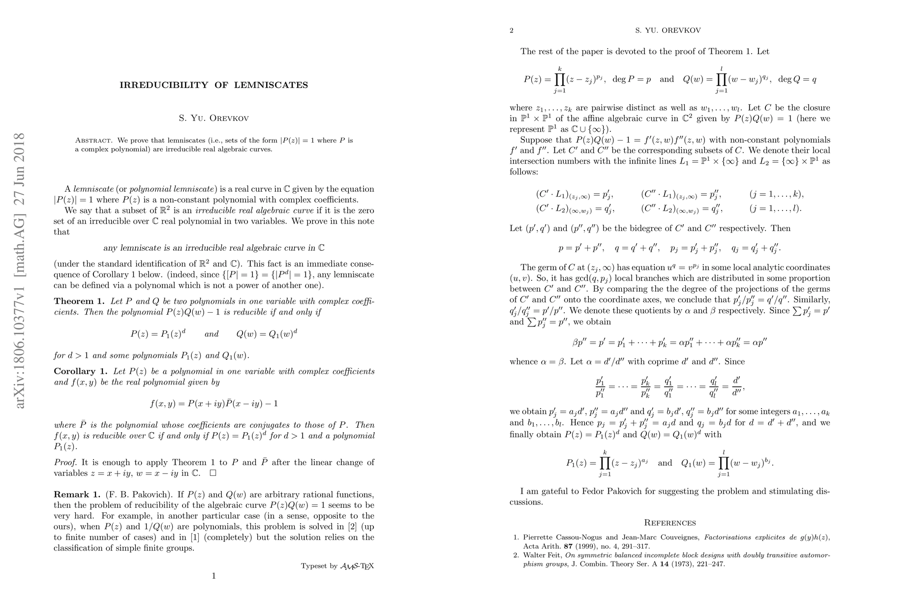 Summary: This paper proves that lemniscates, defined as the set of points where a complex polynomial \( P(z) \) has a magnitude of 1, are irreducible real algebraic curves. The study establishes the fundamental property of these geometric shapes in the context of complex analysis.