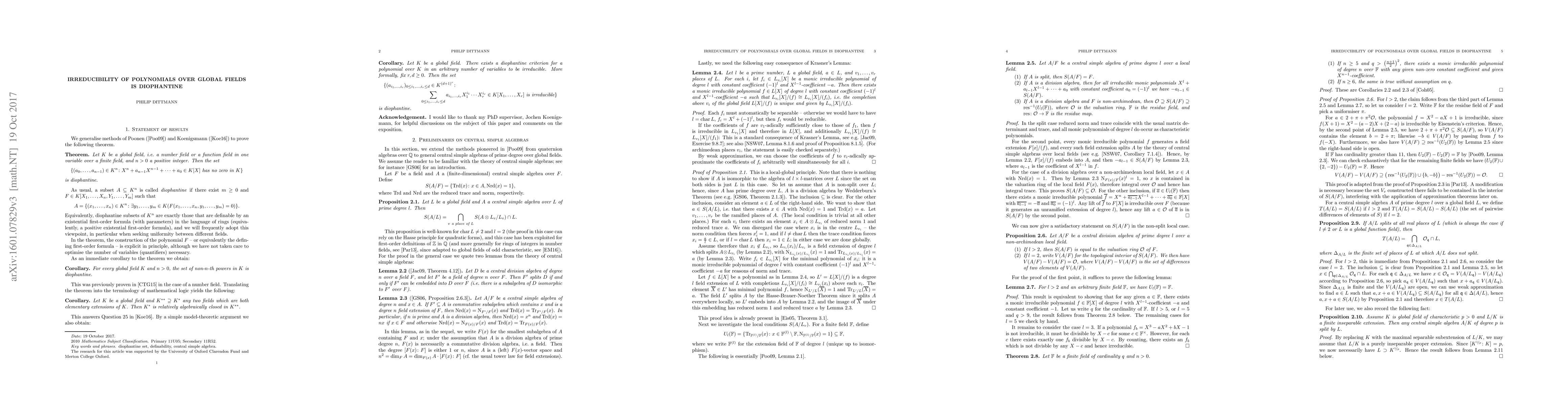 Given a global field $K$ and a positive integer $n$, we present a diophantine criterion for a polynomial in one variable of degree $n$ over $K$ not to have any root in $K$. This strengthens the known result that the set of non-$n$-th-powers in $K$ is diophantine when $K$ is a number field. We also deduce a diophantine criterion for a polynomial over $K$ of given degree in a given number of variables to be irreducible. Our approach is based on a generalisation of the quaternion method used by Poonen and Koenigsmann for first-order definitions of $\mathbb{Z}$ in $\mathbb{Q}$.