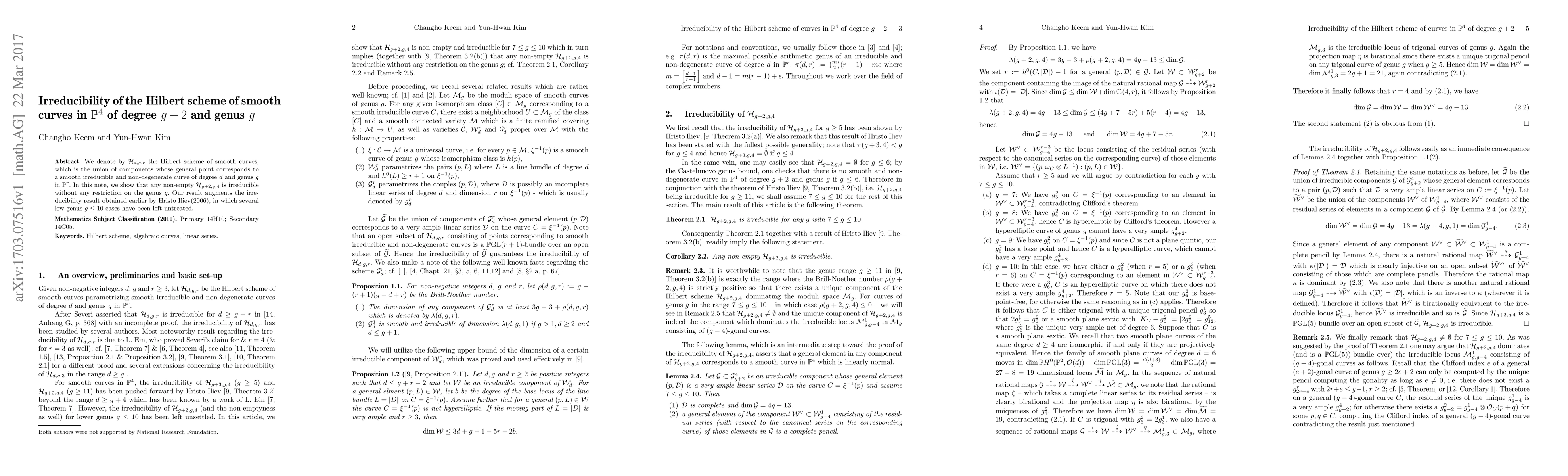 This paper demonstrates the irreducibility of the Hilbert scheme $\mathcal{H}_{g+2,g,4}$ for all genera $g$, filling in gaps left by earlier work by Hristo Iliev that only covered low genus cases up to $g=10$. The result applies to smooth, irreducible, and non-degenerate curves in $\mathbb{P}^4$.
