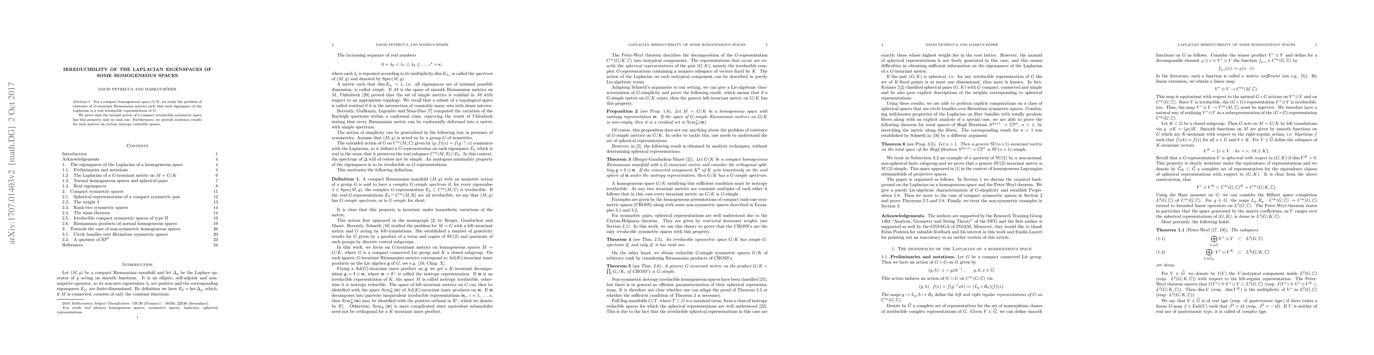 For a compact homogeneous space $G/K$, we study the problem of existence of $G$-invariant Riemannian metrics such that each eigenspace of the Laplacian is a real irreducible representation of $G$. We prove that the normal metric of a compact irreducible symmetric space has this property only in rank one. Furthermore, we provide existence results for such metrics on certain isotropy reducible spaces.