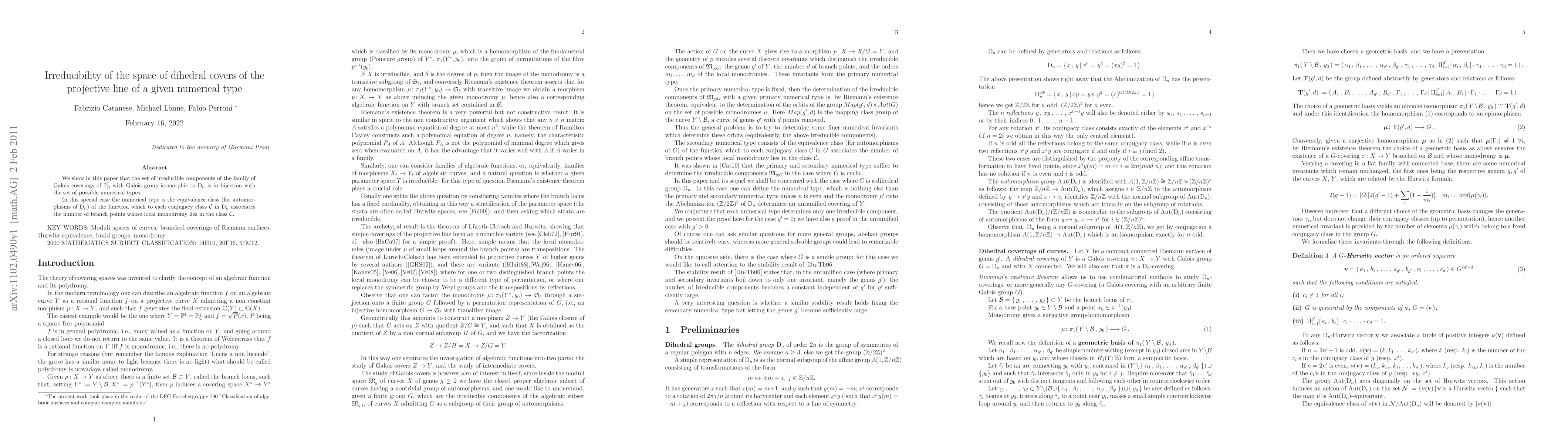 We show in this paper that the set of irreducible components of the family of Galois coverings of P^1_C with Galois group isomorphic to D_n is in bijection with the set of possible numerical types. In this special case the numerical type is the equivalence class (for automorphisms of D_n) of the function which to each conjugacy class \mathcal{C} in D_n associates the number of branch points whose local monodromy lies in the class \mathcal{C}.