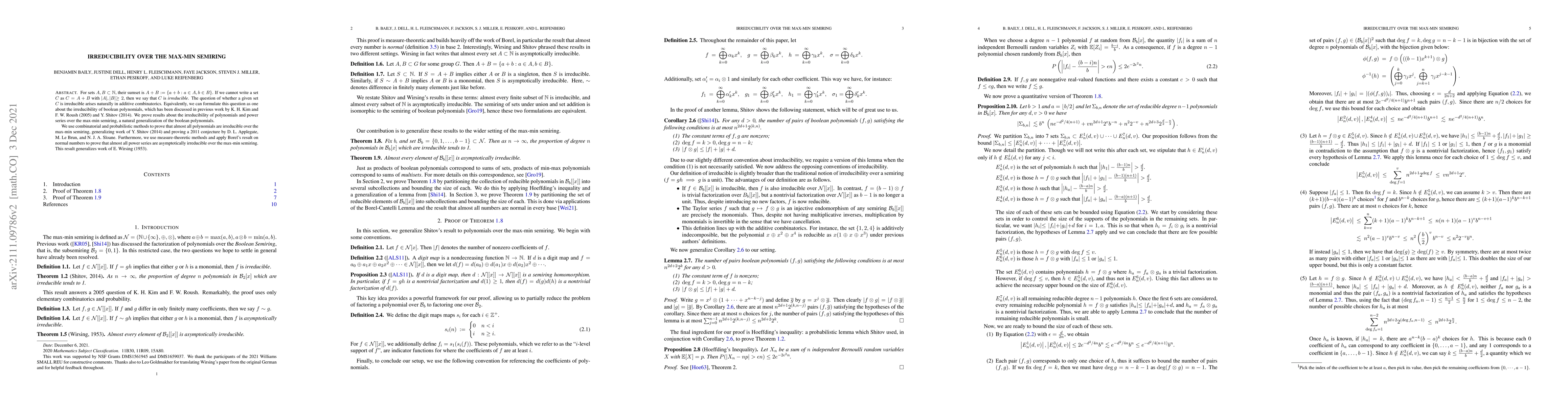 For sets $A, B\subset \mathbb N$, their sumset is $A + B := \{a+b: a\in A, b\in B\}$. If we cannot write a set $C$ as $C = A+B$ with $|A|, |B|\geq 2$, then we say that $C$ is $\textit{irreducible}$. The question of whether a given set $C$ is irreducible arises naturally in additive combinatorics. Equivalently, we can formulate this question as one about the irreducibility of boolean polynomials, which has been discussed in previous work by K. H. Kim and F. W. Roush (2005) and Y. Shitov (2014). We prove results about the irreducibility of polynomials and power series over the max-min semiring, a natural generalization of the boolean polynomials. We use combinatorial and probabilistic methods to prove that almost all polynomials are irreducible over the max-min semiring, generalizing work of Y. Shitov (2014) and proving a 2011 conjecture by D. L. Applegate, M. Le Brun, and N. J. A. Sloane. Furthermore, we use measure-theoretic methods and apply Borel's result on normal numbers to prove that almost all power series are asymptotically irreducible over the max-min semiring. This result generalizes work of E. Wirsing (1953).