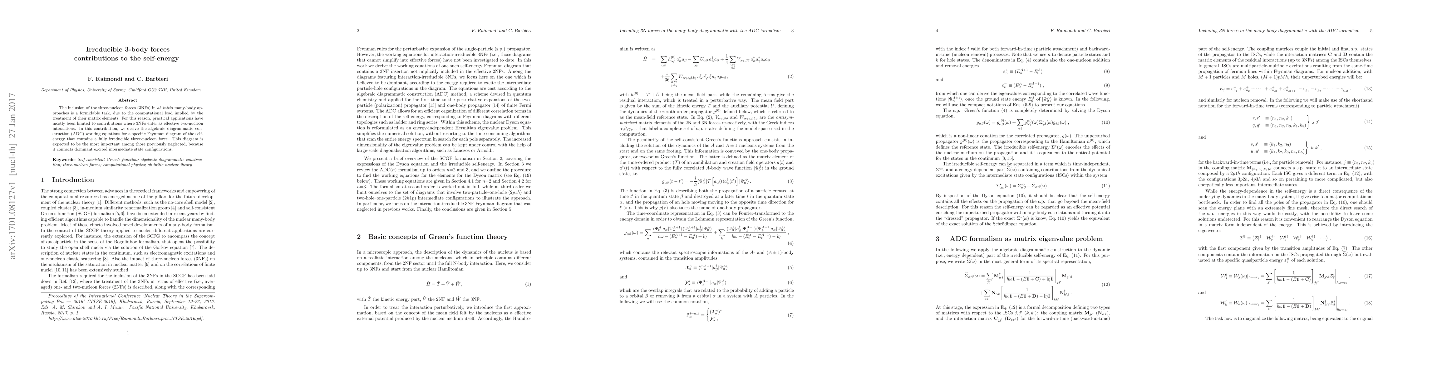 This research derives algebraic diagrammatic construction (ADC) equations for a self-energy Feynman diagram with a fully irreducible three-nucleon force, identifying it as the most significant previously neglected contribution due to its connection with dominant excited intermediate state configurations.