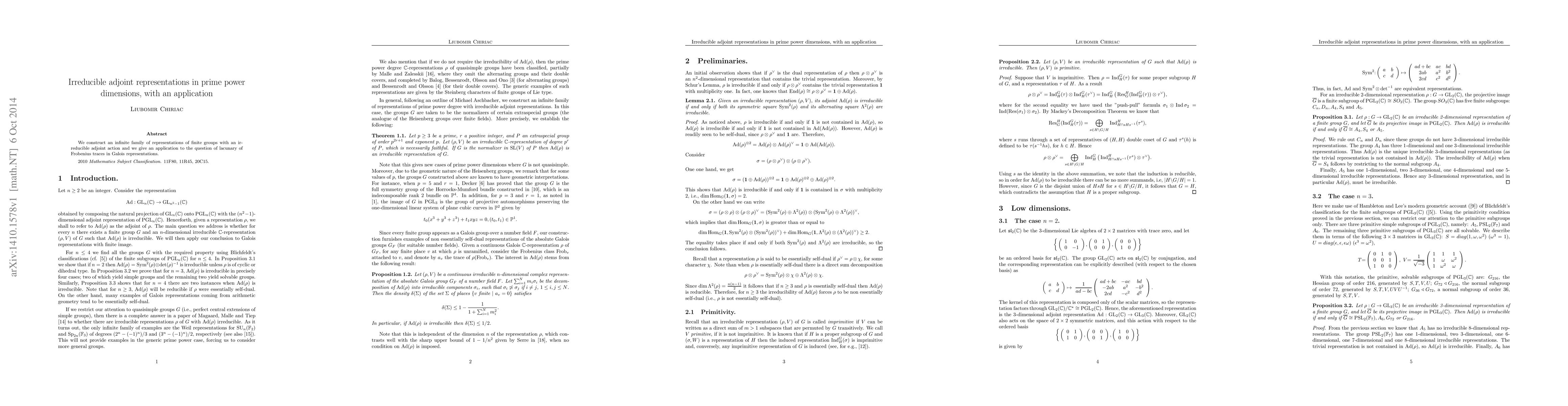 We construct an infinite family of representations of finite groups with an irreducible adjoint action and we give an application to the question of lacunary of Frobenius traces in Galois representations.