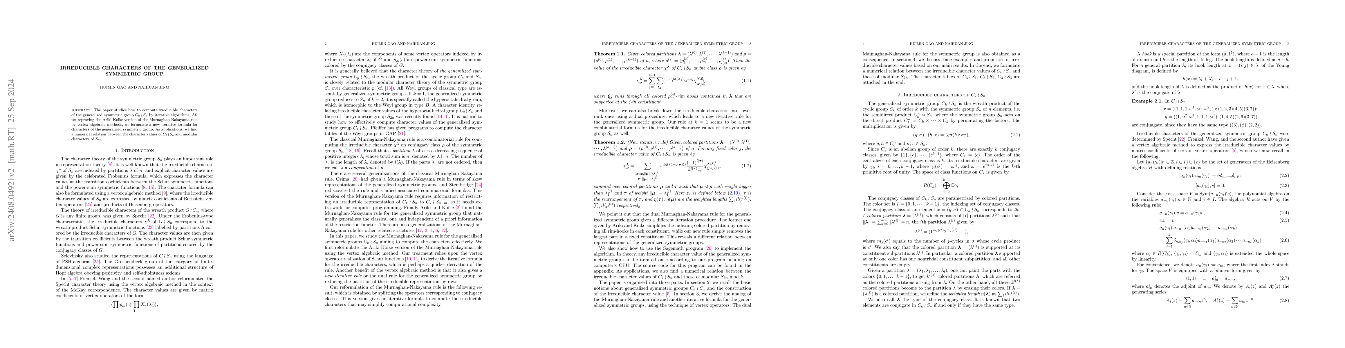 The paper studies how to compute irreducible characters of the generalized symmetric group $C_k\wr{S}_n$ by iterative algorithms. After reproving the Ariki-Koike version of the Murnaghan-Nakayama rule by vertex algebraic methods, we formulate a new iterative formula for characters of the generalized symmetric group. As applications, we find a numerical relation between the character values of $C_k\wr S_n$ and modular characters of $S_{kn}$.