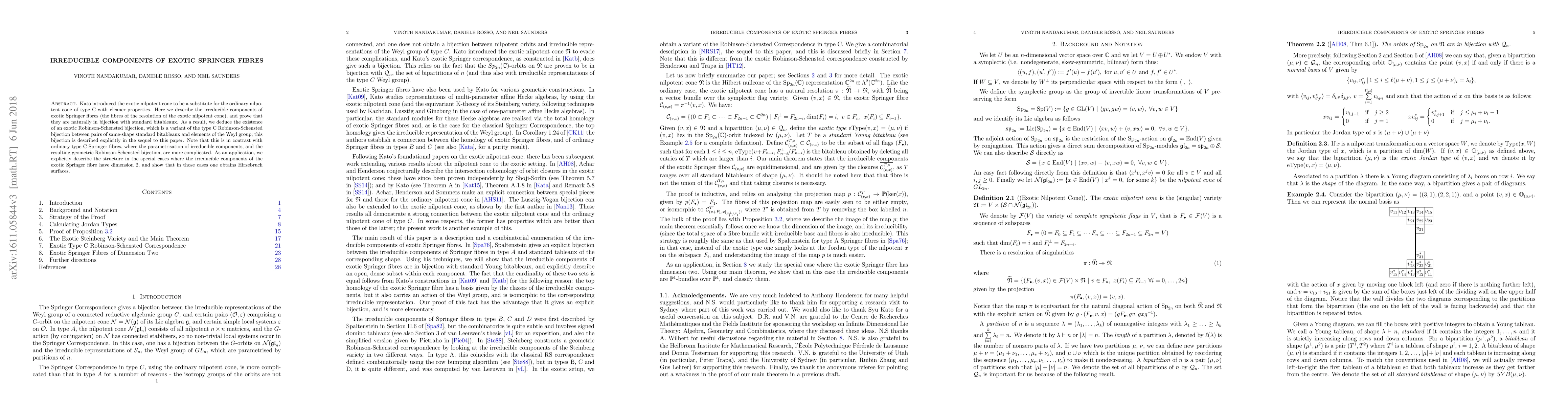 Kato introduced the exotic nilpotent cone to be a substitute for the ordinary nilpotent cone of type C with cleaner properties. Here we describe the irreducible components of exotic Springer fibres (the fibres of the resolution of the exotic nilpotent cone), and prove that they are naturally in bijection with standard bitableaux. As a result, we deduce the existence of an exotic Robinson-Schensted bijection, which is a variant of the type C Robinson-Schensted bijection between pairs of same-shape standard bitableaux and elements of the Weyl group; this bijection is described explicitly in the sequel to this paper. Note that this is in contrast with ordinary type C Springer fibres, where the parametrisation of irreducible components, and the resulting geometric Robinson-Schensted bijection, are more complicated. As an application, we explicitly describe the structure in the special cases where the irreducible components of the exotic Springer fibre have dimension 2, and show that in those cases one obtains Hirzebruch surfaces.