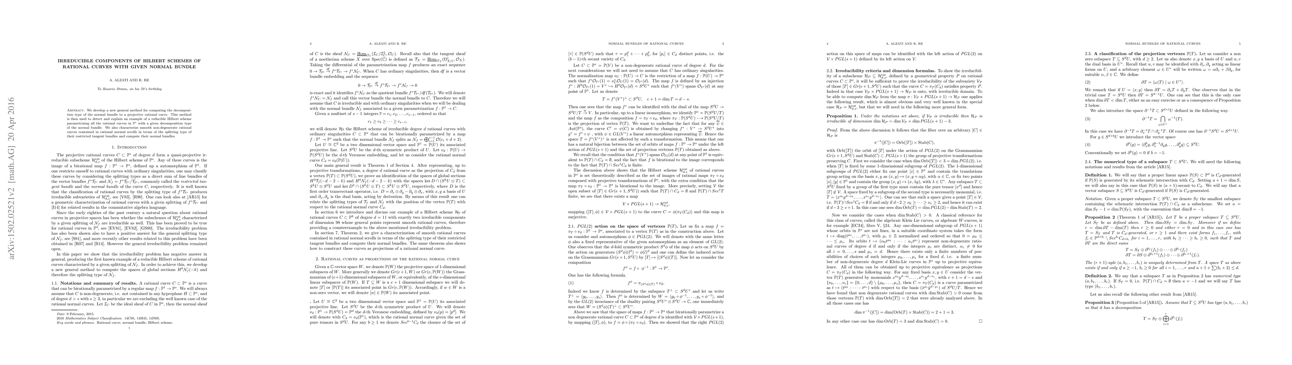 This paper introduces a novel method for determining the decomposition type of the normal bundle for projective rational curves and uses it to analyze a Hilbert scheme that has exactly two irreducible components, answering a longstanding question by showing such schemes need not always be irreducible. It also characterizes smooth non-degenerate rational curves in rational normal scroll surfaces.