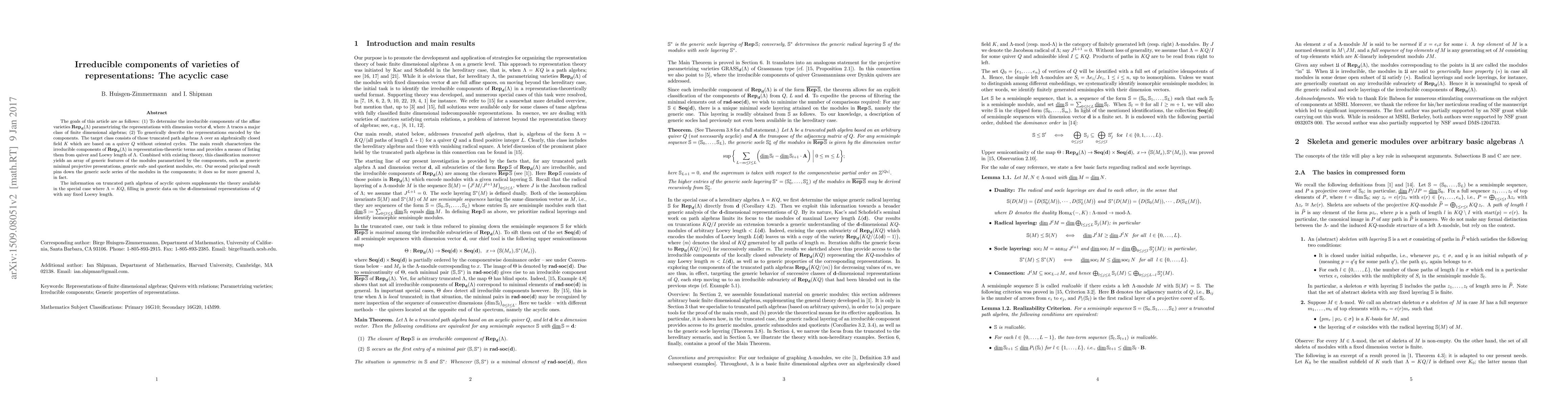 The goals of this article are as follows: (1) To determine the irreducible components of the affine varieties parametrizing the representations of $ \Lambda $ with dimension vector d, where $ \Lambda $ traces a major class of finite dimensional algebras; (2) To generically describe the representations encoded by the components. The target class consists of those truncated path algebras $ \Lambda $ over an algebraically closed field K which are based on a quiver Q without oriented cycles. The main result characterizes the irreducible components of the representation variety in representation-theoretic terms and provides a means of listing them from quiver and Loewy length of $ \Lambda $. Combined with existing theory, this classification moreover yields an array of generic features of the modules parametrized by the components, such as generic minimal projective presentations, generic sub- and quotient modules, etc. Our second principal result pins down the generic socle series of the modules in the components; it does so for more general $ \Lambda $, in fact. The information on truncated path algebras of acyclic quivers supplements the theory available in the special case where $ \Lambda = KQ $, filling in generic data on the d-dimensional representations of Q with any fixed Loewy length.