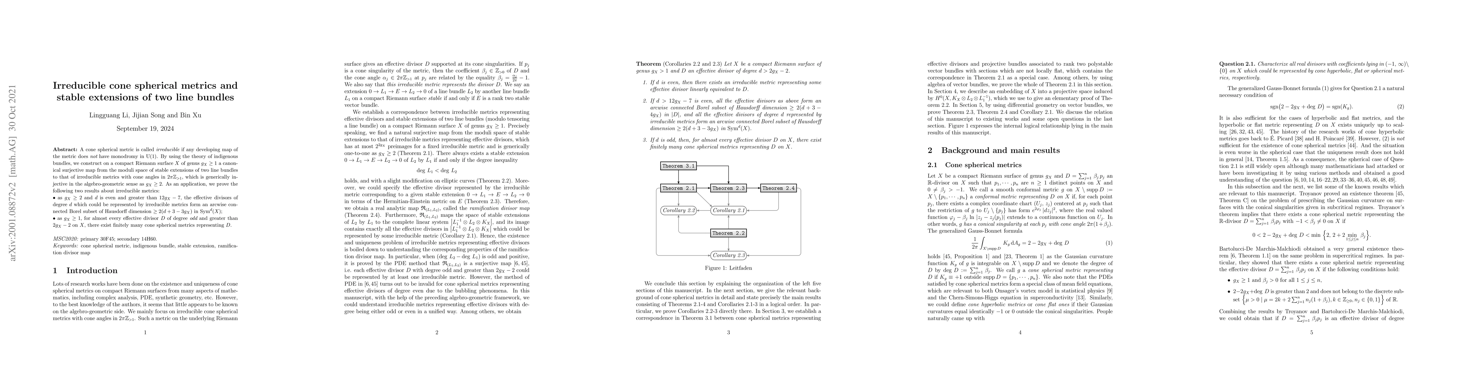 This paper constructs a canonical map from the moduli space of stable extensions of two line bundles on a compact Riemann surface to the moduli space of irreducible cone spherical metrics. It proves that for certain conditions on the genus and degree of divisors, these metrics form arcwise connected Borel subsets and almost every odd-degree divisor has finitely many representing cone spherical metrics.