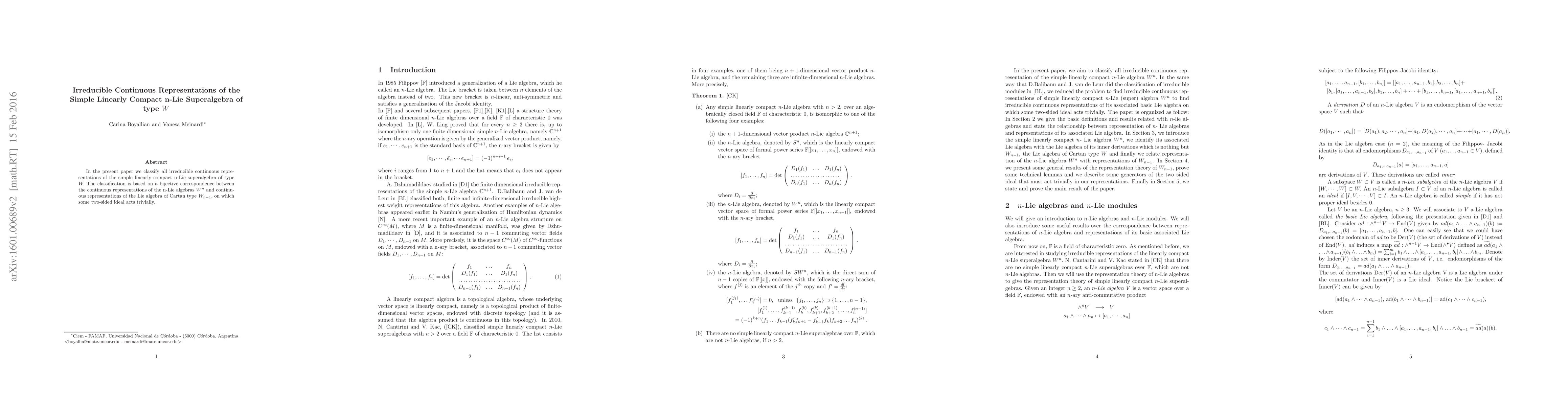 The paper classifies all irreducible continuous representations of the simple linearly compact n-Lie superalgebra of type W, establishing a bijective correspondence between these representations and those of the associated n-Lie algebras W^n and the Lie algebra of Cartan type W_{n-1}.