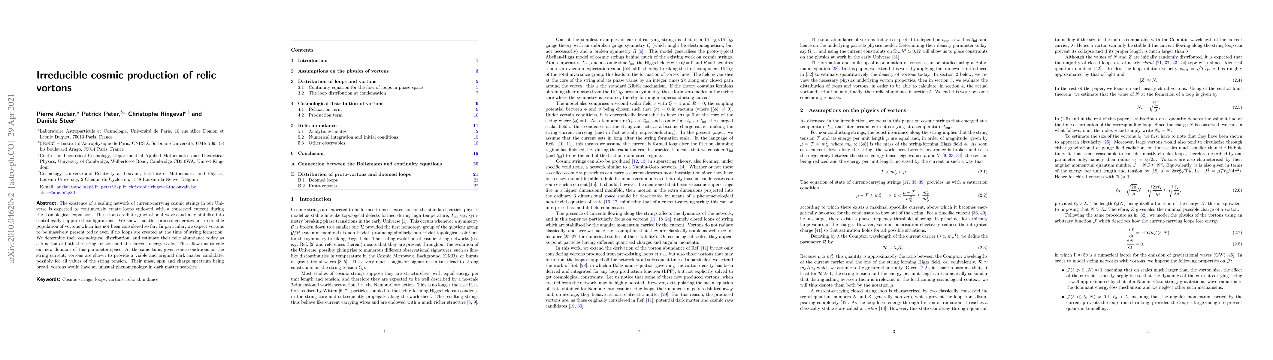 The paper discusses the continuous creation of vortons from scaling networks of current-carrying cosmic strings, predicting their stable presence today and estimating their relic abundance. It argues that vortons could be a viable dark matter candidate, influencing cosmological models and potentially having distinct detection signatures.