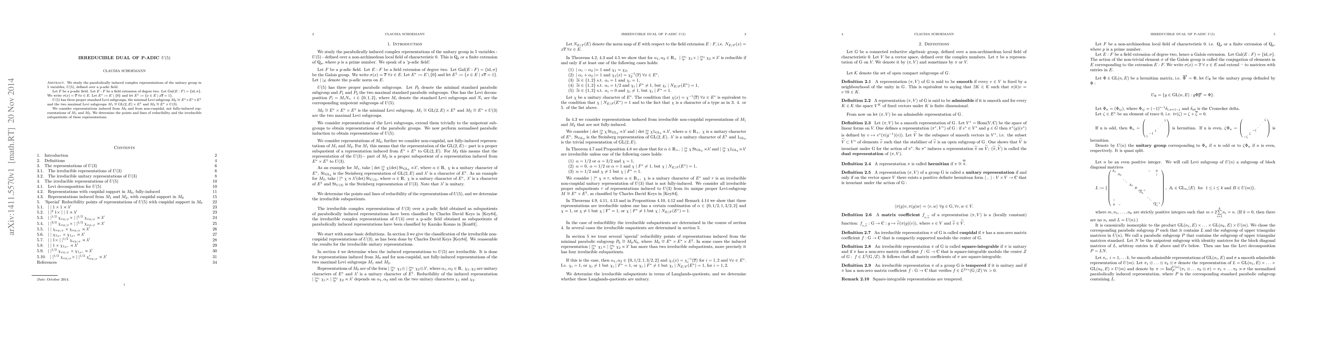 The paper studies the parabolically induced complex representations of the unitary group U(5) over p-adic fields, focusing on representations induced from Levi subgroups M0, M1, and M2, and determining points and lines of reducibility along with irreducible subquotients.